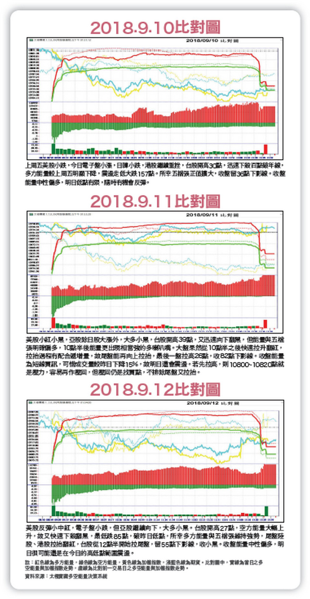 上周本欄已說明:多空關鍵點在一○八二七點,不被跌破,多方趨勢才維持不變。可惜上周五盤中就跌破一○八二七點,雖然收盤站回,但本周一又帶量長黑跌破!表示台股加權指數要下探前低一○六○六至一○六六三點。上周五美股小跌,本周一(九月十日)電子盤小漲,日韓小跌,港股繼續重挫,台股開高三十點,迅速下殺百點破年線,多方能量較上周五明顯下降,震盪走低大跌一五七點,低點來到一○六八九點。所幸五檔張正值擴大,收盤留三十六點下影線。收盤能量中性偏多,次日低點有限,隨時有機會反彈。九月十一日美股小紅小黑,亞股除日股大漲外,大多小黑,台股開高三十九點,又迅速向下翻黑,但能量與五檔張明確偏多,十點半後能量更出現相當強的多方喇叭嘴。大盤果然從十點半之後快速拉升翻紅,拉抬過程有配合遞增量,故尾盤能再向上拉抬,最後一盤拉高二十六點,收八十二點下影線。收盤能量為短線買訊,可惜成交量較周一下降一五%,故周三還會震盪。若先拉高,則一○八○○至一○八二○點就是壓力,容易再作壓回,但壓回仍是找買點,不排除尾盤又拉抬。九月十二日美股反彈小中紅,電子盤小跌,但亞股繼續向下,大多小黑。台股開高二十七點,空方能量大幅上升,故又快速下殺翻黑,最低跌八十五點,小破前一天低點,來到一○六六七點。所幸多方能量與五檔張維持強勢,台股從十二點半開始拉尾盤,留五十五點下影線,收小黑。收盤能量中性偏多,隔天很可能還是在十二日的高低點範圍震盪。本波台股從八月三十日一一一八六點見高拉回十天,共下跌五一九點,九月十二日低點一○六六七點距離八月二十日一○六六三點只差四點,市場空方氣氛瀰漫,但我認為低點已經不多,隨時有機會展開短波段反彈。理由如下:(1)能量並無賣訊,且從本周一開始能量就已偏多,五檔張也明確偏多,故再跌空間有限。很可能在一○六○六至一○六六三點之間,出現買點。(2)從八月三十日下跌至今,外資買超一○六億,且十天當中有六天買超,而融資卻大減百億,因此籌碼落入特定人手中,有助未來向上。然而,我在上周本欄已提醒各位櫃買指數明顯走空,過去五天又重挫七.四%,目前尚無打底跡象,可先觀察一二八.六至一三○點能否止跌。當然,有些中小型股已經超跌,隨時有機會反彈。但若趨勢沒能扭轉,反彈後還是會再跌。各位操作上要多加小心。圖一