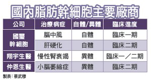 國璽幹細胞於今年八月公開發行生效,證券代碼6704,該公司針對肝硬化、腦中風的幹細胞新藥分別於今年進入人體臨床二期及一期。位於生醫園區的幹細胞新藥製劑藥廠也預計於今年底完工,可謂三喜臨門。目前國璽已是全亞洲發展脂肪間質幹細胞最快的公司,新藥大樓啟用後將可引領台灣成為全球幹細胞發展重鎮。擁十支幹細胞新藥發明專利國璽幹細胞今年火力全開,目前手上握有十支幹細胞新藥發明專利,包含:肝硬化、腦中風、退化性關節炎、自體免疫疾病、抗衰老、肌腱發炎、皮膚再生、坐骨神經炎、急性腎損傷、心律不整等,其中肝硬化新藥與慈濟醫院、台大醫院合作,即將進入臨床二期,腦中風新藥在花蓮慈濟已一期收案結束,準備進入一期結案報告;而退化性關節炎幹細胞新藥則與北榮合作,已申請進入臨床一期。國璽的間質幹細胞是從人體脂肪純化分離而來,據了解,目前常見的間質幹細胞來源有臍帶、骨髓、周邊血液、脂肪等四大類,董事長莊明熙說,臍帶血可以救人,但是不能做藥,因為無法複製;骨髓幹細胞可以治療血液疾病(如血癌),必須配對,治療也有難度;周邊血液的幹細胞數量稀少,必須抽取大量血液,才有足量的間質細胞,只有脂肪取得的幹細胞,可以在體外大量複製並做成臨床用藥,是目前最容易取得,也是最主要的間質幹細胞來源。自體脂肪幹細胞治療 進入人體臨床由脂肪取得的間質幹細胞,在臨床治療上又可分為自體及異體,異體在排斥性及安全上仍有疑慮。因此,衛福部於九月公告《特定醫療技術檢查檢驗醫療儀器施行或使用管理辦法修正草案》,簡稱《特管辦法》僅開放自體部分,包括自體免疫細胞治療、自體間質幹細胞治療、自體周邊血液細胞移植、自體軟骨細胞移植等六項細胞治療,台灣目前有十八個以幹細胞治療的臨床實驗正在進行,其中有十三個屬於間質幹細胞治療,大部分用異體,目前國璽以自體幹細胞的新藥有兩項進入人體臨床階段(見附表)。