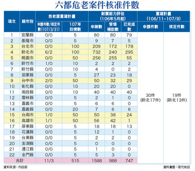都市危險及老舊建築物加速重建條例(簡稱危老條例)」實施已近一年半,當初內政部樂觀預估,全年可以有五百件約上萬戶的成功案例,但在今(二○一八)年九月份的例行記者會所公布的成功案件,全國才十九件,可說是連預期的百分之五都不到,因此,內政部坦言當初「錯估情勢,太過樂觀」。危老條例於去年五月公布實施,法條共有十三條,另施行細則在同年的八月一日公布,有十二條,整部相關法條並不多,主要是希望愈簡單,讓申請危老重建的案件能「快速通關」,加速危險、老舊的房屋能早日重建成功。危老重建 勢在必行根據內政部的統計,全國屋齡三十年以上的住宅建築約有三八四萬戶,其中有四○%是老舊建築需進行耐震評估確認須補強或拆除重建者,但也有約八十六萬戶為最不易都更的三十年以上四、五樓公寓建築。內政部認為,老舊建築易受地震倒塌受損,此外,不易都更的老舊公寓,對隨著屋齡同樣老去的高齡者來說,上下樓梯是一件愈來愈爬不動的事情,尤其台灣又已步入高齡化社會,對於無障礙居住環境的需求增加,故加速危險及老舊建築的重建已是勢在必行。尤其二○一六年二月六日因地震發生,導致台南市永冠維冠金龍大樓倒塌事件,造成一一五條寶貴生命的喪生及無數家庭無家可歸。而花蓮也發生六級地震,前內政部長李鴻源就談到,此震度的地震若發生在台北市,因土壤液化,恐造成四千棟房子倒塌,一時之間,民眾談「震」色變。