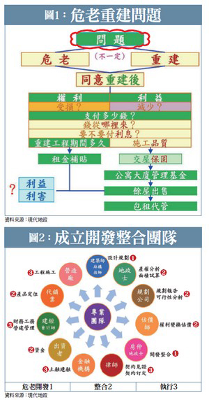 因此,政府規劃《危老條例》上路實施,其加速具危險性老屋重建的立意甚好,值得肯定。內政部也談到,危老條例一是「加速+獎勵」的重建,只要危險老舊建築經一○○%土地及合法建築物所有權人同意後,免經「都市更新審查程序」,只要申請獎勵後即可重建;二是提供小面積危險建築重建管道,讓無法以都市更新方式辦理的小基地也可以進行重建,解決危險及老舊建物的問題;三是打造樂齡住宅,也就是關懷高齡化社會,老屋重建可改善高齡者生活品質,符合高齡者居住之需求。內政部的法案內容,主要是透過「容積獎勵」、「放寬建蔽率及高度管制」及「減免稅賦」等三大獎勵,加速重建。然而內政部自認為非常完善的法案內容規劃,且認為,全國透過危老條例完成的重建案,希望達到核定五百案、約一萬戶的目標,但迄今才十九件的成功案例,顯然績效不彰(見附表)。重建關鍵︱開發整合與溝通能力為何實施成功案例,距離政府的預估會有如此大的落差,問題出在哪?其實說穿了,危老重建的問題,不僅在「危老」+「重建」,最重要在「開發」與「整合」及整個「溝通協調」的能力或技巧還未到位。