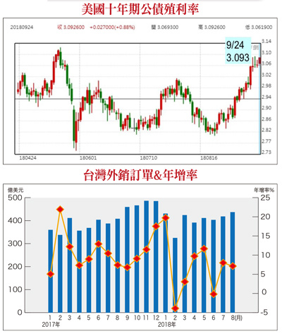 中美兩國二四日正式對彼此開徵新一輪關稅,不同的是美國對價值兩千億美元中國商品加徵的關稅,預計明年一月一日將從一○%調升至二五%,而且先前白宮的聲明還指出,若中國對美國農民或其他產業採取報復行動,美方將立即進行第三階段報復,也就是對價值約二六七○億美元的中國產品加徵額外關稅。正當第二階段加徵關稅大戰啟動之際,中國大陸於二四日發布《關於中美經貿摩擦的事實與中方立場》白皮書,闡明陸方八大立場,除譴責美國的貿易霸凌行為破壞國際經濟秩序,也明白表示談判不能在關稅大棒的威脅下進行。顯然,雙方歧見逐步深化,在美國期中選舉前談判已難以期待。美方第三階段,對價值約二六七○億美元的中國產品加徵額外關稅,目前看來也難以避免了。所以,市場期待訊息面的利空出盡,投資人還要再等一等。由於全球貿易規則不確定性日增,可能使全球進出口成長不如預期,對企業投資的干擾程度不易評估,也許因為這樣的狀態可能會持續一陣子。因此,經濟合作暨發展組織(OECD)日前也不約而同的調降今明兩年全球經濟成長預估,今年的成長率由三.八%下修至三.七%,二○一九年由三.九%下修至三.七%。美國FOMC會議會後聲明 攸關未來升息速度