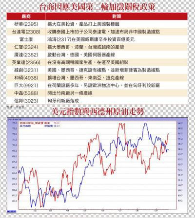 台灣外銷訂單優於預期 九~十月營收值得期待由於美股仍處多方格局,美元指數也處於整理型態,這樣的外部環境相對有利台股發展。不過,真正的核心力量還是台灣經濟的基本面強度。台灣經濟對出口的依賴度相當高,從三月份以來,市場對中美貿易戰的擔憂就沒少過,幸虧台灣外銷訂單除了六月(淡季)年增率不如預期以外,大體上皆優於預期。根據日前經濟部新公布的數據,八月外銷訂單達四三六.八億美元,優於市場預期並創歷年同月新高,年增率為七.一%。其中,資訊通信產品為一一五.九億美元,為歷年同月新高,年增一○.○%;電子產品為一一五.六億美元,亦為歷年同月新高,年增九.六%。主要因為雲端資料中心需求暢旺,加上各品牌智慧型手機新品陸續上市,加上電競產品及新興科技需求熱絡,帶動晶片、封測、記憶體、被動元件、印刷電路板等供應鏈接單成長所致。顯然,目前整體接單狀況受到貿易戰的影響暫時仍不明顯,尤其經濟部統計處預估,九月外銷訂單金額會有更明顯成長,大約四八二~四九二億美元,可望較八月成長十.四~十二.六%,年增率估約五.○~七.一%。由此推論,整體上市櫃公司九月~十月的營收可望相當亮麗,並進而推升整體第三季的獲利展望。生產基地未局限於大陸 台達電未來相對具優勢雖然目前中美貿易衝突暫時尚未影響到台灣外銷訂單,不過,觀察去年台灣廠商海外生產比為五三.二%,而在中國大陸生產比率占四七.九%,顯示海外生產大部分都在中國大陸生產。所以,未來若台商受到影響,國內提供原材料或零組件之廠商就會受到影響。因此,生產基地未局限於中國大陸的廠商,受到貿易戰的影響可望較小,接單將具相對優勢,這是未來選股的重要方向。例如電源供應器龍頭廠台達電(2308),早已加速佈局非中國大陸製造據點,目前工廠遍及台灣、大陸、日本、韓國、泰國、印度、美國、墨西哥、巴西、斯洛伐克;仁寶也將增加墨西哥、波蘭、台灣或越南的產能;和碩短期打算增加捷克、墨西哥和台灣產能,長期可能到印度或東南亞設廠,未來可分散地緣政治風險。