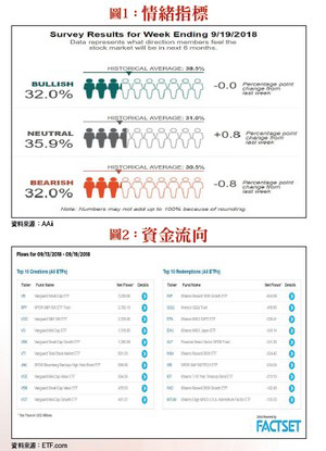 美國對中國加徵二千億美元商品關稅正式上路,金融市場卻是出現利空出盡的反應,美股創高、陸股反彈,如前一周所預期展開市場誤判後資金回補行情。根據EPFRGlobal數據顯示,近一周(九月十三日至九月十九日)流入美國股票型基金的資金量高達一四五億美元,規模創今年三月中以來單週最大流入量,提供推升美股向上挑戰的銀彈。但因美國投資人情緒未因美股走強而高漲,可預期未來在美股各指數陸續創高下,錯估形勢的投資人一定又會改變態度,反手追買美股。近一周美國散戶情緒指數(圖一)變化不大,看多者比例持平,仍低於歷史平均值六.五個百分點。看空者比例略減○.八個百分點降至三二%,略高於歷史平均值的三○.五%。中立者比例則小增○.八個百分點,升至三五.九%,高於歷史均值的三一%,顯示觀望者仍多。同期間的ETF資金流向(圖二),有別於前一周轉進避險性資產的操作,開始認錯回補美股ETF,買超前五名ETF的金額均超過十億美元,且包含美國大型、中型股及小型股 ,九月二十及九月二十一日的流入量更為驚人,光SPY一檔ETF兩天就流入七九.三億美元,顯示資金回補力道有加大的跡象。原先美國投資人偏好的科技股ETFQQQ,則因心態尚未翻多,仍在進行調節的動作,但若未來情緒轉趨樂觀,QQQ勢必又會重回買超排行中。避險資金回補美股ETF 科技股及新興亞股將跟進另隨著美元指數向下跌破近四個月的整理區間,加上美韓達成貿易新協議,雙方貿易量有望提高,預期對中國以外的新興亞洲國家也有機會比照辦理,降低中美貿易戰所帶來的衝擊,有利增添資金回補新興亞股的意願,預期相關ETF應也有機會重回買超名單中。
