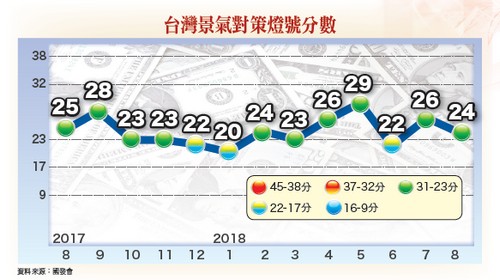 至於新公布的美國九月份ISM 製造業採購經理人指數(PMI)為五九.八,雖然較前月六一.三回落,但仍連續二五個月位於高水位擴張區間,顯示製造業仍呈現穩定成長格局。分項中的就業指數上升至五八.八,為今年二月以來新高,反映生產活動增溫帶動了人力需求;新訂單分項持續處於六十之高度擴張區間,顯示訂單前景無須過分擔憂,隨著時序走入美國的消費旺季,將有助於未來的生產活動表現,由此推論次月的ISM製造業數據可望維持強勁。當然,除了美股基本面等外部條件以外,資金的移動方向也至關重要,觀察指標在美元指數。在美聯儲未宣布升息以前,美元指數處於弱勢整理,資金流入亞洲新興市場意願較高,外資一度連續九天買超台股,累計買超五四三億元新台幣。近日美元指數出現反彈,外資隨即反手賣超,若未來美元指數持續反彈,台股就相對不易受到外資加持,將限縮加權指數上檔空間,投資人必須留意。景氣放緩美中不足 影響台股市場信心如前所述,目前台股的外部環境除了美元指數反彈稍稍對台股不利以外,美股發展仍對台股有利。至於台股的內部條件,經濟增速可能放緩是美中不足之處,將使市場所有參與者信心不足。觀察國發會依股價、工業生產、海關出口等九項指標所彙編的景氣綜合判斷分數,八月份降至二十四分較上月減兩分,所對映的是綠燈,為連續兩個月綠燈,景氣雖處於復甦,但復甦力道不足。重點是原來呈連續(三~六月)上揚的景氣領先指標, 七~八月分別跌○.○五%與○.○九%,已連跌兩個月,未來景氣所面臨的挑戰將更為嚴峻。
