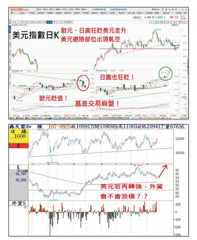 近期美元指數的強、弱以及升、貶走勢成為市場上討論的話題,筆者在過去的文章裡也試著利用幾個不同的角度來論述未來美元指數走弱之後對市場將造成的影響,以及後續讀者該如何調整操作策略,上周FED無懸念的宣布升息一碼之後,美元指數開始出現強漲走勢,守住了低點九三.八的支撐,把九月二十一日該周所留下的黑K棒給完全吞噬,甚至已經再次回到九十五以上的強勢區間,顯見接下來的金融市場恐將再面臨一波風險的來臨!避險被軋空 強逼美元升值原先筆者規劃的行情是美元指數在歐元、英鎊的回升行中開始向下走弱,當美元指數走弱,資金將會再次從美國流出,有利於全球金融市場的反彈,尤其是股市的反彈。但是在這次FED升息之後,反而造成了市場對於FED明年持續升息的預期,這股預期反映在美元匯率的升值表現上,而這股升值的強勢,竟也讓過去長期在日圓與美元、歐元與美元的套利交易的風險快速發生,造成避險部位快速的出現軋空行情,在兩股勢力的加乘效果之下,讓美元快速的升值走強!美國經濟過熱 升息不得不發另外,還有一個重大的因素來自於這次美國公布貿易逆差金額的擴大,也是造成美元強升值的主要原因。一般來說,貿易逆差金額的擴大,簡單解釋就是對外進口大於出口金額才會造成逆差,但若是用另一個方式來思考:為什麼是對外進口的多?是不是因為國內的生產已經無法滿足消費者需求,所以才要擴大對外進口?如果是因為國內的生產已經無法滿足消費者需求而擴大對外進口,這不就是間接證明美國景氣過熱嗎?當美國景氣過熱時,FED當然會對於升息的態度較為鷹派,若是用泰勒法則計算當前美國應適用的聯邦基準利率,應該是約略落在四.五%,跟現在的利率水準約還有十碼的差距,這也是為什麼雖然川普不滿利率決策結果,鮑威爾卻仍然只能升息的主要原因!資金行情效應仍不明顯美元指數再次回升到九十五以上,再次讓先前筆者所預估的美元指數本波漲幅滿足將有挑戰三位數實力的機會大大提升,當然只要美元指數走強,原先台股的第四季資金行情可能在時間上就會受到些許影響,因為只要美元持續走強,資金的磁吸效應就會跟上一波血洗新興市場一樣慘烈。留意到這次當IMF再次金援阿根廷時,其貨幣並沒有能有效止住資金外逃效應,相信土耳其可能也會再次遭受資金外逃的壓力,全球股市在今年第四季的反彈行情,可能會在美元持續升值的效應中落空。金融為長線價值投資首選其中值得一提的是台股近期外資超過百億的大買超,買超的標的多數都集中在金融股,同時,筆者對於國內電子股的反彈行情本就不太抱希望,因此在規劃上,即使有資金行情,台股的指數也不見得會有超過五百點的大行情。從技術分析的差異比較上,不難發現台股就指數而言是處於盤整狀態,也不太建議做空,若要偏多操作,以金融或是傳產為主,其中從籌碼的集中度來說,金融股為首選,以今年的金融股獲利頻創新高來說,價差雖不如電子股誘人,至少能穩健的維持多頭格局,對長線投資人來說,是可以賺股息跟價差的好標的!