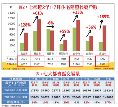 台灣房市自二○一四年拉回整理,已經四年多,一些供給量大的地區,房價也大幅修正二至三成,自今(二○一八)年起,買氣有回升,不少民眾開始關心,房市落底了嗎?何時是進場的好時機?但與其關心房市落不落底,有自住需求者,倒不如注意一些房市利空訊號,挑議價高的區域進場「殺很大」。房市三高不利房價人有三高,也就是「高血壓、高血糖及高血脂」,有三高的人,都得開始注意身體保健問題,才不會被疾病所苦。而房市也有「三高」,永慶房產集團總經理葉凌棋表示,「今年使用執照量創十年新高」、「今年建照核發量創十年來第三高」,以及「全台新建待售餘屋量高達七.四五萬戶」,都可稱之為「房市三高」。葉凌棋表示,根據內政部統計,二○一二年至二○一七年全台新建餘屋量逐年攀升,到二○一六年穩定,但二○一七年第四季仍有七.四五萬戶,為八年來最高待售水位,市場仍充斥大量餘屋,賣壓沉重。此外,根據內政部統計,二○一七年第四季,七都中以新北與桃園超過一.三萬戶最多,分別為一萬三七八三戶及一萬三五五八戶,另高雄餘屋量為一萬一一七二戶,也突破萬戶大關,顯示新北、桃園與高雄三大都會區市場賣壓沉重。至於今年一至七月全台使照量為五.四萬戶,創十年來新高,並較二○一七年的四.五萬戶增加二○%,顯示進入新成屋入市高峰期,市場賣壓恐增。而除了台中減少外,其餘六都使照量均較二○一七年增加,其中台北、新竹、高雄增幅超過四成,以戶數看,新北使照量近兩年均破萬戶,今、明兩年賣壓最重(圖一)。再看今年一至七月,全台建照核發量為六.八萬戶,創十年來第三高,較二○一七年四.五三萬棟成長五○%,葉凌棋表示,若以每個建案約二至三年的施工期來推算,二○二○年至二○二一年新增供給恐爆量。而七都除了桃園量縮外,其餘六都建照量較二○一七年均大增至少三成以上,其中台北市今年建照量為十年新高的六六五七件,但二○一七年才二九二一件,暴增一.二七倍,而高雄市建照核發量為九三三二件,也較去年的三二三二件暴增一.八八倍。另須留意,今年新北、台中建照量達萬戶以上,顯見今年建商推案信心大增,但預計二○二○年至二○二一年的新增供給也恐爆量(圖二)。今年推案量上衝兆元另根據《住展雜誌》統計,北台灣今年上半年新成屋、預售屋推案量達五六一五億餘元,較去年同期暴增逾一千六百億,增幅約四成,預計全年推案量將突破一兆元大關,創下史上第三高紀錄。