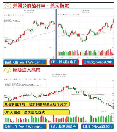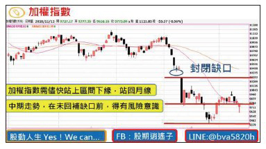 在連續多期的周刊,我們都有提到,如果加權指數要走回升行情的話,必須得回補十月十一日的跳空缺口一○三○○點,這個缺口封閉了,空頭才沒戲唱,未回補缺口前,都得提防會有個主跌段的到來。為什麼這個缺口這麼重要?我們可以看到今年加權指數二月六日跳空缺口封閉後,後面才又走了半年的多頭行情! 美股在十一月十二日長黑重挫,三大指數跌幅都有來到二%,費半更是重挫四%,使得台股加權指數在十一月十三日開盤跟著大跌,改變加權指數在十月三十一日帶量長紅回到十月十一日長黑區間沿著月線反覆震盪整理的慣性,雖然最後開低走高收在相對高,但我們後續還是得提高警覺,觀察能否儘快站上月線,萬一十一月十三日的低點再次跌破,不排除回測再打第二支腳!那美股在跌什麼?主要還是之前在周刊專欄,我們曾經跟大家提到的兩個指標,美國公債殖利率、美元指數,在FED的利率會議中,十二月再次升息的機率還是存在著,消息一出,亞洲股市在十一月九日紛紛走跌,美元指數應聲大漲,美元指數走揚,會使得資金加速從新興市場撤出,外債比重高的國家會首當其衝,萬一這些國家撐不住,會進一步造成全球股市動盪!同時美元的走揚,會壓抑到原物料的走勢,最明顯的即屬輕原油,油價這波跌幅相當重,跌幅高達二三%,正式進入熊市,油價除了受美元指數影響外,最重要的是因為供需改變,當供給持續增加,需求卻因經濟走緩而減少,即使日前OPEC宣布要減產,也看不到止跌的現象。這些大宗原物料商品,通常視為全球經濟增長的領先指標,當大宗原物料商品價格因增長放緩而下跌時,很難想像股市還會持續往上漲!再來是科技股表現不如預期,包括蘋果、高通、亞馬遜……等股價紛紛重挫,其中蘋果釋出的消息,導致蘋概股再殺一波,在這之前,我們已經在周刊一再提醒投資朋友,要小心蘋概股,如果投資朋友有避開蘋概股的下殺,我們真是功德無量!接下來的行情,還是有許多不確定性,因為中美貿易戰打得沒完沒了,月底的G20會議就很關鍵了,所以投資朋友在這邊,一定得習慣放空操作,我們一再跟投資朋友提醒,只要善設停損,做多跟做空的風險是一樣的,當你把每一檔個股當作一個獨立的大盤,多空都可以操作,個股多空操作在不確定的行情起了保護的效果,同時做多有底部型態,做空有頭部型態的,有機會兩邊都賺,如果在這邊,你不知道怎麼應對行情的不確定性,歡迎大家加入我們的群組!