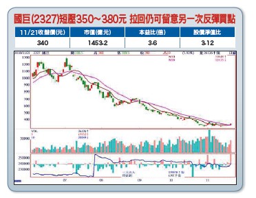 若川習會結果不如預期,即兩千億美元商品照原定明年初二五%關稅生效,甚至美國再加碼二六七○億美元商品課稅,則會後恐因失望性賣壓讓國際股市和台股再跌一段下去。於年底或明年初觸底,大漲一波瘋狗浪行情上去。記得五月至七月初,被動元件、矽晶圓和工具機等長線高檔股,基本面利多天天滿天飛時,只有筆者獨排眾議建議讀者小心追高的風險,並一路善意提醒大家站賣方操作,勿摸底勿搶短。還一直跟讀者分享一個很重要的觀念,就是股價一路往下盤跌而法人賣,九成通常背後有基本面利空。國巨我們從一三○○元一路看空下來,十月初三八○至四百元首次進場搶短,馬上急彈到四四二元獲利出場。十一月初彈到月線上下三七五元再建議手中有的人賣一趟,有聽建議跟著如此操作者,應該都可賺到不少價差。第四季到明年二月景氣審慎保守,明年獲利EPS法人估大減至四十至六十元,不過股價從一三一○元下來早已事先反映八、九成,所以再下來應該是尋求報復性反彈的大買點,因券資比過高明年初會有一波融券強迫回補強力軋空行情,以及因今年獲利佳明年市場預期有一○%至二○%以上的高股息殖利率題材。