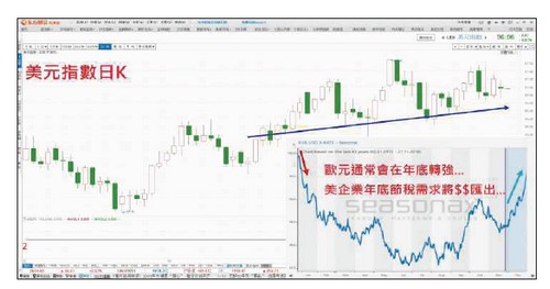 在G20全球峰會期間中美之間終於出現了和緩的會面,這次的會晤結果讓全球市場都出現了個大反彈,但其實在這之前,美股早就已經先預告了這次的和平結果,金融市場看重的是這「九十天的停戰期」,與其說金融市場看重,不如說是美方高度看重,因為在會後各自的記者會當中出現了明顯的差異,光是這停戰期,中國就隻字不提,而擴大農產品的採購也是只有美方向市場宣布,所以看起來平和的表面,卻仍然有著各自角力以及堅持的重點。貨幣政策才是趨勢依歸而對於未來全球市場的行情研判仍是著重在貨幣政策的變動,不只是FED的利率態度,甚至於到歐洲央行能否在年底全面退出量化寬鬆,以及中國人行面對FED升息壓力的減緩會如何應對,最後,日本的黑田會如何調整央行貨幣政策,都在筆者的觀察當中,畢竟「所有的資產價格都是一種貨幣現象」,貨幣政策的調整影響的還有資金的流向,只要能夠判斷資金流向,對於趨勢的掌握就能了然於胸,投資操作上才能有所依據。現在正在進行的調整是筆者在前兩期文章中就已經提到,甚至在公開媒體就先提醒投資朋友注意,相信長期透過群組關注的讀者早已知道。美元指數大概率走跌目前筆者對於美元指數轉弱的看法沒有改變,只是在等待一個確認訊號,從技術面上來看就是等美元指數確認跌破前波低點九十六,就可以確定本波美元指數的起跌,這個機會越來越大。