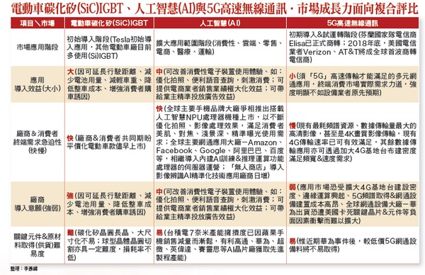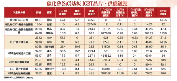 與目前可說已進入擴大應用階段的「人工智慧(AI)」,以及才剛邁進初步、試點型商轉的「5G無線通訊」二項人類新科技應用領域與產業相比之下,在加速成長、日漸擴大的電動車產業與終端應用市場中,有助全球電動車市規模加速成長的關鍵利器-「碳化矽(SiC)基板IGBT(Insulated Gate Bipolar Transistor,絕緣柵雙極型電晶體)晶片」,預料將很有機會成為全球電動車市場、產業界,乃至於資本市場在內的各方參與者,未來高度重視的一個基礎、關鍵元件板塊。高效減重降成本 效益明顯 碳化矽(SiC)IGBT供不應求IGBT晶片為車用功率半導體之一,「IGBT晶片」、「動力電池電芯」被市場並稱為電動車「雙芯」,為影響電動車性能重要關鍵技術。IGBT因具備「高電能轉換效益(「原始交直流電壓轉換損耗電量」,可減少高達八五%)」,有利電動車電池動力更具傳輸、驅動效率,同時也可明顯減少電池用量、降低整車成本、增強消費者購車誘因,可以說已一躍而成為全球主要汽車半導體電子大廠,急欲快速擴大供給能量,增加搭載數量策略考量下,共同關注的「戰略型」重兵器。預估未來將會有越來越多的汽車廠,在主逆變器(Inverter)模組中,搭載SiC IGBT功率半導體晶片,尤其是中國車廠,近幾年來相繼開始評估、使用SiC功率半導體元件。目前為全球產量最大電動車廠-比亞迪(BYD),早於二○○五年即組建自身研發團隊,投入重金、鉅資佈局IGBT產業。二○○九年九月,比亞迪IGBT晶片成功通過中國電器工業協會電力電子分會組織科技成果鑒定。此外,比亞迪也已陸續成功掌握,IGBT晶片設計、製造、模組設計及製造、大功率器件測試應用平臺、電控、電源等環節技術,於十二月十三日所推出「IGBT4.0」,於電能損耗、溫度控制能力等二大關鍵指標上,雙雙取得有效重要突破。比亞迪於十二月十三日「IGBT電動中國芯」發佈會上,宣佈已投入鉅資佈局半導體材料SiC(碳化矽)應用市場,同時也將進一步統整材料(高純度碳化矽粉)、單晶、外延(磊晶)、晶片製造、晶片封裝等,SiC基半導體元件上下游完整產業鏈。由此不難想見,比亞迪對SiC IGBT的需求慾望&渴望!因此,二○一七~二○二三年,SiC功率半導體元件於主逆變器市場複合平均年增率(CAGR),將高達一○八%,市場應用規模將爆發性成長。碳化矽基板IGBT晶片 相關材料製程供應鏈股雨露均霑