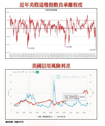 上周提到十分重要的觀盤重點,不論明(二〇一九)年升息次數縮減至幾次,是利多還是利空,都得經過市場考驗。主要原因在於升息次數太少甚至不升息,雖是貨幣政策重啟寬鬆的利多,但恐將落實了明年景氣快速惡化的揣測;若升息次數高於市場預期,股市又得承受貨幣緊縮的壓力。美股短線負乖離大 隨時醞釀強力反彈所以,聯邦公開市場委員會(FOMC)會後聲明接下來兩個交易日的股市表現至關重要,因為其代表市場的認同度或未來的信心度。很不幸的,股市出現多數投資人不願意看到的走勢,美股於十九日聯準會(FED)主席鮑爾進行會後聲明的當下開始一路下殺,台北時間截至十二月二十五日短短四個交易日,美股道瓊指數下跌了一八八二點,創造了百年來最慘的聖誕節,累計十二月以來道瓊指數已重挫三七四六點(跌一四.六七%)。按照西方慣用標準,科技股NASDAQ指數由八月二十九日高點以來回檔逾二○%,率先符合熊市標準;原先期待只是單一事件,可是目前S&P500指數也剛好達標,約四分之三的成分股已深陷熊市,道瓊指數只差臨臨門一腳,岌岌可危,這一切顯然並非偶發,科技股成為領先指標。現階段美股利空訊息尚未盡除,包括部分美國政府部門關閉、明年經濟成長趨緩、聯準會還將升息兩次、企業減稅效應逐漸消退、美中貿易僵局持續等,皆使資金風險偏好快速降溫,爭相撤離股市無可厚非。