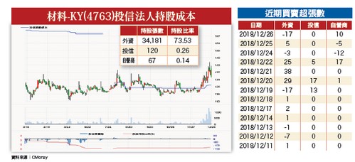 FED縮表就不一樣了,按照目前進度為每月五百億美元,一年就達六千億美元,市場活生生的少掉這些鈔票,若加上乘數效應,不只可能推高企業發債利率,其緊縮效應可能讓槓桿貸款市場或高收益債市場有斷鏈風險,目前風險利差明顯上揚就是警訊。(註:信用風險利差=美林CCC級高收益債券殖利率-美國十年期政府公債殖利率,此指標反映市場對未來企業違約風險的預期。)將焦點拉回台灣,美股若反彈,將有利於台股多方反擊;美元近期的轉弱,也有利於資金回流亞股。不過,權值股的回補積極度得取決於市場法人對經濟前景的看法,觀察現狀,加權指數的表現空間也將因景氣基本面的下滑而限縮。外銷訂單衰退影響12月營收 限縮指數反彈空間根據經濟部公布的十一月外銷訂單,金額為四七六.八億美元,比去同期衰退二.○六%,也比十月下滑二.六七%。由於美中貿易戰已影響各國投資意願,導致台灣機械設備的訂單銳減一一%,而受到國際油價暴跌,影響塑化產品價格,塑、橡膠製品接單年減七.七%。受智慧手機成長放緩,加以記憶體庫存調整價格下跌,也使十一月的電子產品接單年減三.五%。而光學器材訂單年減九.四%,是因中國產能開出擴大供過於求壓力,價格出現下跌。展望十二月外銷訂單,因去年十二月基期仍高,加上主力的資訊通信及電子產品今年換機需求平平且逐漸進入淡季,加上美中貿易戰不確定性及油價低迷等問題仍存,十二月外銷接單可能延續十一月衰退情勢,經濟部統計預估十二月接單金額將降到二五五至二六五億美元,年減率預估四.一~六.一%。美中貿易雖可望在元旦過後進入正式協商,但雙方若無法在三月一日前達成具體協議,中國將面臨美國把二千億美元商品關稅從一○%提高至二五%,恐間接影響台灣外銷動能。另外,台灣電子業接單除要面臨手機、半導體景氣趨緩壓力外,華為通訊設備陸續遭到美、歐、日等政府禁用,也可能波及台灣相關廠商訂單。如前所述,既然指數表現空間已限縮,選股策略自然以個別題材為主,搭配技術面或籌碼的優勢作短線應對。新增產能+報價上揚 材料-KY擁有雙重利多例如材料-KY(4763),主要生產二醋酸纖維素絲束,基地位於山東省濟南市,醋酸纖維素由天然纖維製成,可應用於菸用濾嘴、濾芯、不織布面膜等,目前公司菸用濾嘴產比占比達九○%。二醋酸纖維素絲束(簡稱絲束)終端以生產香菸濾嘴為主,國際生產廠商市佔分別為Celance占三九%、Eastman三○%、Solvay一五%、Daicel一四%、材料KY僅占二%,生產者多為一貫整合廠,並且呈現寡佔。二○一八年木漿與石化原料價格上漲,合約價格並未能反映原料成本而侵蝕獲利,因此廠商開始對二○一九年的合約價格調漲,Celanese、Rhodia分別於九月與十一月調漲一美元/KG(漲幅約二○%),有利於材料-KY明年的報價。為了降低原料價格波動的影響,公司目前開始朝向上游原料發展,設立中峰化學(持股八○%)生產醋酸纖維素,可供應絲束原料自用需求,並可外售塑料級產品,銷售地區多集中為開發中市場,比例分別為亞洲占五九%,美洲二○%,非洲一九%。初期塑料級品質尚不穩定平均外售單價僅有二萬人民幣/噸,隨著品質提升,平均單價已提升至二.八萬人民幣/噸,同時積極擴展塑料出海口,目前正與義大利廠商LA-ES商討進行策略聯盟,LA-ES在中國生產板材產品並外銷歐洲,每年醋片用量達到一千噸。材料-KY過去因原料醋酐價格高漲,侵蝕醋片廠獲利表現,然而醋酐價格已由高檔八○五○人民幣/噸下跌至六○二五人民幣/噸,醋片獲利將可大幅回升,另外,二○一九年絲束合約價計畫調漲三~五%,以及擴增兩條產線合計二千噸產能將可帶來營運效益,法人預估二○一九年EPS約為九.一二元,年增率達九六%,幾乎翻倍,值得投資人密切追蹤。