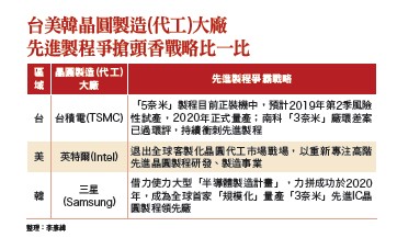 南韓政府現階段正推行一項「大型半導體製造群體計畫」,此項計畫將整合四家大型半導體製造廠與大約五十家上下游零組件及設備廠來推動執行,南韓政府針對該計畫,預計於十年內,投入高達一二○兆韓圜(約新台幣三.五兆元)左右鉅資推動。其中,南韓記憶體大廠SK海力士將在此一半導體製造大群體中,資本投資興建一座新記憶體工廠。除了提早出手卡位,藉由展開擴大記憶體產能規模,卡好卡緊、圍堵中國記憶體廠後市成長壯大之路外,南韓半導體大廠三星電子,同時也藉由加快「三奈米」先進IC晶圓製程量產腳步,擴大市場競爭戰線,企圖同步堵死全球晶圓代工龍頭廠台積電(2330)高階先進IC晶圓(片)製程領先腳步。南韓政府、企業目前不只與中國半導體廠明爭暗鬥,奮力搶奪市占率,同時也積極動作,全力進行研發計畫,力拚全球高階先進製程代工市場市占率最高廠台積電,意圖於二○二○年,成為全球首家規模化量產「三奈米」先進IC晶圓製程的領先廠,強勢甩開台積電與英特爾(Intel)。如此一來,也等同正式拉開全球半導體晶圓製造(代工)產業,「三奈米先進晶圓製程」爭霸戰序幕。三星晶圓代工業務負責人於國際電子元件會議(IEDM)上表示,三星已經完成三奈米製程技術性能驗證,正進一步精進製程技術,目標預定於二○二○年正式大規模量產三奈米製程,將超前台積電二○二二年三奈米製程正式量產時間表。過去全球晶圓代工市場,三星也曾有過領先紀錄,包括三二奈米、一四奈米、一○奈米等IC晶圓製程節點,都曾率先量產。不過,七奈米製程節點技術大規模量產進度,三星明顯落後台積電,且連自家「Exynos 9820處理器」亦未使用其內含EUV(極紫外光)技術的七奈米製程,反而運用由一○奈米製程所改進「八奈米LPP」製程。儘管名稱聽起來似乎與七奈米製程相去不遠,唯實際上與華為麒麟980、蘋果A12、高通驍龍855等新一代智慧型手機旗艦級處理器相比下,IC晶片製程技術仍落後一個世代。全球晶圓代工市場目前由台積電一家獨大,囊括全球晶圓代工市場高達六○%左右市占率。不僅營收規模遠遠超越其他競爭對手廠,而且最先進「七奈米」製程開始量產後,幾乎壟斷全球所有七奈米晶圓代工訂單。台積電表示,今年共製造五○款以上七奈米晶片,明(二○一九)年還會有一○○個以上的七奈米及七奈米加強版製程代工訂單在手。