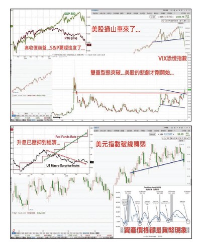 美股的連番重挫,從黑色星期一變成黑色一星期,現在看起來黑色耶誕節的機率很高,到現在為止美股並沒有真正出現任何重大災情,所謂「重大災情」指的是像金融海嘯時所發生的企業倒閉潮、金融體系風險等,如:貝爾斯登、雷曼兄弟等的風險,但是預估在不久的將來一定會再有如同當時的雷曼兄弟的金融業出現重大風險,現在筆者心中的唯一名單是─德意志銀行!這間銀行所掌管的衍生性金融商品占全球一○%以上,金額達到七十五萬億美元,一旦發生風險,後果將比當年的雷曼兄弟嚴重。美股跌非「鮑」之罪除此之外,這次十一月的美國黑色星期五的零售銷售的人均消費出現大幅度的下滑,從去年的三三五美元到今(二〇一八)年的三一三美元,在耐久財的汽車的預估銷售數字中也同樣出現持續下滑的現象,再加上美國的驚奇指數仍然處於一路下滑的趨勢中,可知到明年美國的經濟景氣下行的機會是持續增加的。這次雖然FED維持升息步調被指為是讓美股下跌的兇手,但其實FED原本就面對著升息與否的兩難,筆者在每天的盤前節目跟YouTube平台中領先提醒升息會讓利率加速倒掛,不升息則是告訴市場美國景氣提前衰退,所以升不升息,美股都跌定了!川普隻手難撐美股再從美股的技術面來看,美股才剛剛形成一年的大頭部,顯示著至少美股有一年的空頭時間,從均線來看更是出現空頭排列,年線下彎的現象,而且最重要的是上個星期美股下跌時都是帶著大量下殺,這很明顯的是高檔的壓低出貨現象,當然有人賣就有人買,買的人大概都是散戶或是川普的鐵粉吧!相信川普能護住美股,很可惜,當趨勢反轉時,即使有通天的本領也很難隻手回天。站在好處想,美股終於開始補跌,最大的利空帶著全球齊跌,若再配合上美元的貶值,未來美股跌完之後,其他市場的反彈解套空間就比較值得期待,否則,台股明年作帳變擴大結帳,作美夢變作惡夢行情,未來要觀察就是美元指數!不恐慌時反而最危險另外,還有一個重要指標就是VIX恐慌指數,當美股已經殺破今年二月六日股災低點時,竟然VIX指數還只在二十五至三十而已?殺成這樣美國投資人都不怕,這才是短線上投資人要害怕的地方。今年二月六日股災時,恐慌指數一度來到五十以上,這才出現了低點,也才進入後續的震盪打底反彈的行情,但是現在看起來市場並未處於極度恐慌,也代表美股的低點還沒到。當然,從技術面看,恐慌指數已經打出了個一年左右的頭肩底型,漲幅滿足看計算波段至少到四字頭,短線上美股恐怕還是凶多吉少!利用海選 年終自己拚在操作上,筆者建議不用一定只執著在台股當中操作,無論是做多或放空都是如此,海外的指數、商品期貨市場都是技術分析的天堂,透過海期、海選都可以在看對方向後獲得不錯利潤。在金融市場操作一整年,最後到了年終,總是在這行情趨勢確立之際,大膽地向它要個年終獎金,而且只要敢要,通通有獎,只是看各位要不要而已!