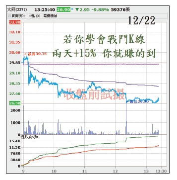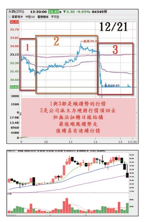 十二月中下旬後,台股最火熱的焦點就是大同集團,因為大同集團的本體公司正在進行經營權之爭,以及子公司華映(2475)、綠能(3519)將聲請重整,導致大同公司的股價開始出現劇烈波動,子公司股價也連續跌停板。那麼,究竟彭哥今天要給大家什麼啟發呢?讓彭哥娓娓道來。大同(2371)在今(二○一八)年六月份開始進行第一波的股權爭奪戰,當時股價從二十二元開始向上拉升至四十元附近,直至近期股價才開始有回落的情形。在一般民眾的觀念裡,大同一直是一個傳統電子製造商及通路,所生產的大同電鍋具有懷舊風,簡單好用又不貴,但也因為這樣股價也無法有效的提升,導致連續十七年的投資效益都無法發放股利,也因公司經營的策略錯誤,不管在台灣及大陸的不動產投資都是持續虧損狀態。這個現象也延續到子公司的經營,在太陽能矽晶圓的需求不斷降低下,股價也如同需求下滑一般從二十元一路慘跌至五元以下,也因華映的資金周轉不靈同時發生,導致綠能及華映也在近期將要進行公司重整。從以上攤開的公司經營模式可以發現,大同集團幾乎都是選擇到夕陽工業的產品,這是公司經營策略端的問題,在此只能祈禱公司重整後能有一番新作為。而在十二月二十一日(星期五)下午大同的法說會,出現三圓建設王光祥董事長積極布局將推翻以林郭文艷為首的原大同經營團隊,希望藉由新的人事布局來扭轉大同日見衰敗的現象,而在法說會上唯一的一個重點就是「大同子公司尚志的不動產,將被有價值的利用」,照字面上看來,就是要用有價值的不動產繼續換現金來支撐現狀,所以尚志(3579)也是未來會靠非本業實現營收的一檔股票,是轉機或是繼續靠賣祖產過日子,我們就繼續關注、拭目以待。從大同的股價結構來看,自從跌破三十六元之後,整體股價走勢就已經從多頭趨勢轉為多頭回檔走法,且又經過上周五(十二月二十一日)的市場派大戰公司派的漲跌互殺的走勢後,以空方為主的股市資金主力派是大勝的。而從十二月二十一日的大同股價走勢就可以看到,要扭轉股價結構若遇到強勢空方結構是困難的,當原本是空的走勢遇到公司派的抵抗,盤中突然急拉九%,再遭逢資金主力連續不間斷的五百張賣單襲擊,在五分鐘之內從漲三%直接殺至跌停板,可見資金主力的雄厚,以及要修理公司派的態度。所以要提醒投資人若這樣的股價結構持續向下發展,要再回到二十元甚至十五元以下的機率會升高,若你能掌握股價結構判斷方式,你就取得財富的獲利門票,讓我們一起來驗證股價結構的重要性吧。