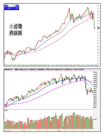 台股已經走完整個二○一八年的行情,在去年的行情走勢型態為末期多頭轉空頭起跌走勢,去年股市剛好以半年為一個週期,六月之前是走強勢多頭攻擊向上的走勢。從七月強勢族群股如矽晶圓、被動元件、MOSFET、PA放大器、光學股、蘋概股等,均開始由盛轉衰,而且當營收發布得越好,股價跌勢就更強,讓完全相信「基本面好=股價好」的投資人跌破一堆眼鏡,也挖破了存錢口袋。會發生這種現象不意外,這就是真實的股市資金的多空迷人之處,善用這樣的行情絕對能夠賺到大錢。若只會做多不會做空的投資人,在這裡就是傳說中的多頭股市投資人墳墓,來一個殺一個、來兩個殺一雙。而近期台股與美股還在持續探底,究竟在二○一九年,台股是否能夠觸底反彈起漲或是繼續崩下去,本期彭哥用兩張美股的週線圖與台股加權指數週線圖來做一個比照,告訴大家如何用股價結構來預測後勢發展。從附圖可以看到美股現在的狀態,我用小道瓊指數與那斯達克100指數的週線圖來解析,可以看到目前這兩個指數的位階已經都在三條均線之下,這就是一個標準的空頭排列組合,而且有近期低點持續破低、近期高點不過高的現象出現,這些都是走強勁空方的一種走勢,縱使美股因為短線跌得太兇以至於股價均線差的乖離度擴大反彈修正,都不會走向中長期上漲行情,投資人必須要先建立好這樣的思維,就是「在未出現不破低過高的轉變型態之前,任何一種反彈都是續跌的開始」,唯有堅持法則,才能夠度過股市空頭海嘯的襲擊。