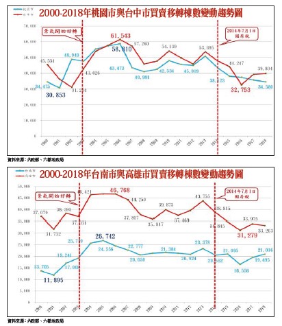 又是新的一年的開始,在中美貿易戰不確定因素干擾之下,全球股市此起彼落,台灣經濟同樣在擔憂豬瘟疫情擴散及兩岸關係上,面對更多不確定的風險。就房市而言,根據六都地政局所公布去年十二月的買賣移轉棟數,除台南較十一月份略增外,其他各都都還是呈現下滑。因此,想請教莊教授,較股市率先起跌的房地產市場,在新的一年,挾帶著台商回流的利多,是否能有止跌回穩的契機?根據六都地政局公布資料,二○一八年十二月買賣移轉棟數,台北市為二一三八棟,月減○.七%,年增一四.四%;新北市四五八八棟,月減七.六%,年增九%;桃園市二九七八棟,月減二.二%,年減二.九%;台中市三六九三棟,月減○.六%,年增一.二%;台南市一七八七棟,月增三.九%,年增七.八%;高雄市二七六二棟,月減四.一%,年減二.一%。總計六都共一七九四六棟,月減二.九%,年增四.一%(詳請參閱附表)。由此可知,原本業者寄望九合一選舉之後,以及年底作帳行情可以提高交易數量的預期落空,因此,對於二○一八年的市場景氣依舊是乏善可陳,至於二○一九年仍應是差距不大。至於二○○○至二○一八年全國及六都之買賣移轉棟數變化趨勢,請參閱附圖。二○一九年買賣移轉仍難大幅增加從六都的買賣移轉數量觀察,月增的僅有台南市,但增加幅度不大,年增的計有台北市、新北市、台中市、台南市,月跟年都減少的有桃園市及高雄市,累計二○一八年六都買賣移轉共二一二一六○棟。