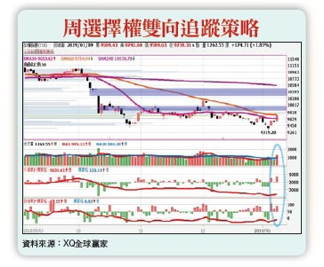 沒有聖誕行情,卻引出了個元月行情。投資人看到了中美雙方協商的平穩進程,對雙方達成協議產生了預期,讓股市藉機宣洩去年第四季以來的怨氣。不過美股這一波反彈還在半山腰,以道瓊工業指數來說,八日的收盤價為二三七八七點,距離前波起跌的頸線位置二四二七九還有二%的空間,而這道關卡不是達陣就可交差了事,而是必須突破並站穩才能再次獲得多方的認同。而月中的企業財報,便是能否帶動指數過關的關鍵。受到國際市場強勢反彈的氛圍帶動,台股久違的出現帶量上漲的情景。更難得的是沉寂許久的外資,在元月九日出現百億買盤,也讓成份股的報價欄位出現了好久不見的滿江紅。從技術面分析,加權指數來到季線九七五四點反壓的位置,再上去便是從去年十月中旬開始構築的箱型整理區,其上緣壓力帶九九五○點。若要給這一波反彈先設定一個完美的句點,那台股要能回補去年十月十一日的跳空缺口,回到一○四五○點。而這一道道的關卡,只有籌碼願意動作,才有突破的機會。所以我們開始來觀察籌碼的部分,首先是外資的期貨未平倉,元月九日的淨多單為四萬四千多口,在一個星期之內,外資期貨多單累積加碼了一萬五千多口,表示外資對台股的態度偏向樂觀。接著從自營商的選擇權未平倉部位來觀察, Sell Call減碼至四萬多口,賣權由Buy Put轉變為Sell Put七千多口。整體來看,技術面上有壓力,但籌碼呈現積極偏多布局,一月期貨合約又即將結算,因此近期指數波動將開始放大,可以突破(買方跨式或勒式)策略來進行布局。