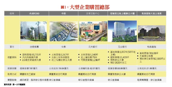 建商及壽險業已進場隨著市區可售的新辦公大樓有限與辦公室租金逐步上升,除了向建商購置整棟的預售大樓外,不少大型企業轉而購置素地自建總部,大幅提前因應辦公空間增長的需求。例如元大銀行以八十二億元標下仁愛路三段的空軍活動中心地上權,和泰產險及中鼎集團則分別在大直及北投士林科技園區購入土地興建總部。信義全球資產經理王維宏表示,市場歷經谷底盤整後,去年商用市場恢復力道強勁,辦公室去化表現優,以自用型買方為首的買氣陸續回籠,建商及壽險金融業陸續投入商用市場,許多大型企業購置辦公室當總部使用,例如玉山銀行買下冠德建設興建中的敦北國際企業總部,做總部擴充使用。戴德梁行研究顧問部協理薛惠珍則談到台灣房地產投資市場經數年盤整,於去年底重返二○一二年以來的交易金額高點,全年交易額以九九六億元收紅盤,較二○一七年躍升一.四倍,其中第四季交易金額居全年之冠,占全年的四三%,達四二六.四億元,較上季遽增二一七%,主要動能來自企業總部自用需求、REITs重返市場及工業廠房,其中尤以企業自用辦公需求最為顯著。