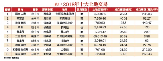去(二○一八)年台灣商用不動產市場,不管是土地、大樓交易或是租賃市場,甚至是廠辦交易都有亮點。根據各商仲業的統計,成交量都較往年放大,不僅建商進場購地,就連壽險公司都搶進地上權案,且共享辦公室也成為一大趨勢,使得二○一九年商用不動產,應該可再紅火一年。商辦及土地表現強勁高力國際董事總經理劉學龍指出,去年可說是商用不動產表現強勁的一年,根據統計,不單全年商用不動產成交總額重新站回八百億元關卡,突破自二○一五年起連續三年未達該門檻的低迷情況外,土地市場更是熱絡,全年累積成交總額高達一八八二億元,更為近五年新高。第一太平戴維斯董事總經理黃瑞楠表示,去年大型商用不動產與土地市場雙雙繳出連續兩年成長的成績單,顯示台灣不動產市場在經濟穩定復甦帶動企業置產信心下,已走出房地合一稅所帶來的陰影。辦公需求擴張是二○一八年商用不動產市場的一大亮點,受到企業升級辦公空間與B辦業主積極參與都市更新或危老重建的影響下,大型企業購置總部的動能增加,合計市區辦公室與內湖科學園區廠辦的交易金額達到五○四億元,占整體市場的四九%。去年度前三大單筆交易都是源於自用辦公需求,如台塑集團為因應敦北總部大樓的都更計畫,斥資一八七億元購入大內科全新完工廠辦,成為去年度最大單筆投資紀錄,第二名為陽信銀行以七六.五億元購入忠泰建設的中山北路辦公大樓預售案,第三名則是玉山銀行以六○.九億元購入冠德敦北地上權辦公大樓預售案(圖一)。