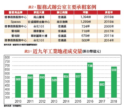 共享辦公室是新租賃趨勢去年租賃市場另一亮點是共享辦公室(co-working space)的趨勢興起,劉建宇指出,新創產業支出與人力皆精簡化,帶動共享辦公室及開放式自由桌位辦公型態崛起。回顧二○一八年,共享辦公業者更成為美洲及亞太區租賃市場的最主要需求來源。他說,仲量亦接到共享辦公業者洽詢,表示欲在台灣擴展營運版圖,詢問主要縣市的辦公大樓空間,預計共享辦公空間可望成未來新租賃趨勢。瑞普萊坊商業物業代理部資深經理陳瑛佳表示,根據市場研究暨顧問部調查服務式辦公室,包括商務中心及進階版的共享辦公室,有別於傳統辦公室市場租期長、初期投入固定成本高的限制,再加上近年新商業模式的轉變,搭上共享經濟熱潮,因此客製化服務且租期彈性的共享辦公室從商務中心蛻變,成為市場新寵兒(表二)。其中,更有四大明顯趨勢:一、承租面積累計破萬坪;二、十年來承租A辦面積成長八倍;三、合計年租金規模破億元;四、單點需求規模暴增。王維宏也認為,共享辦公室趨勢的興起,對於頂級辦公的需求提高,在未來供給有限的情況下,將帶動北市商辦租金持續走揚,空置率下降幅度更為明顯。世邦魏理仕台灣交易與顧問部主管陳頌民表示,「隨著商業環境快速變化,部分大型企業已開始提高投資組合彈性,採用靈活辦公空間以省去資本支出及辦公室裝修的費用,也因此推升了靈活辦公空間的成長。工業土地揚眉吐氣