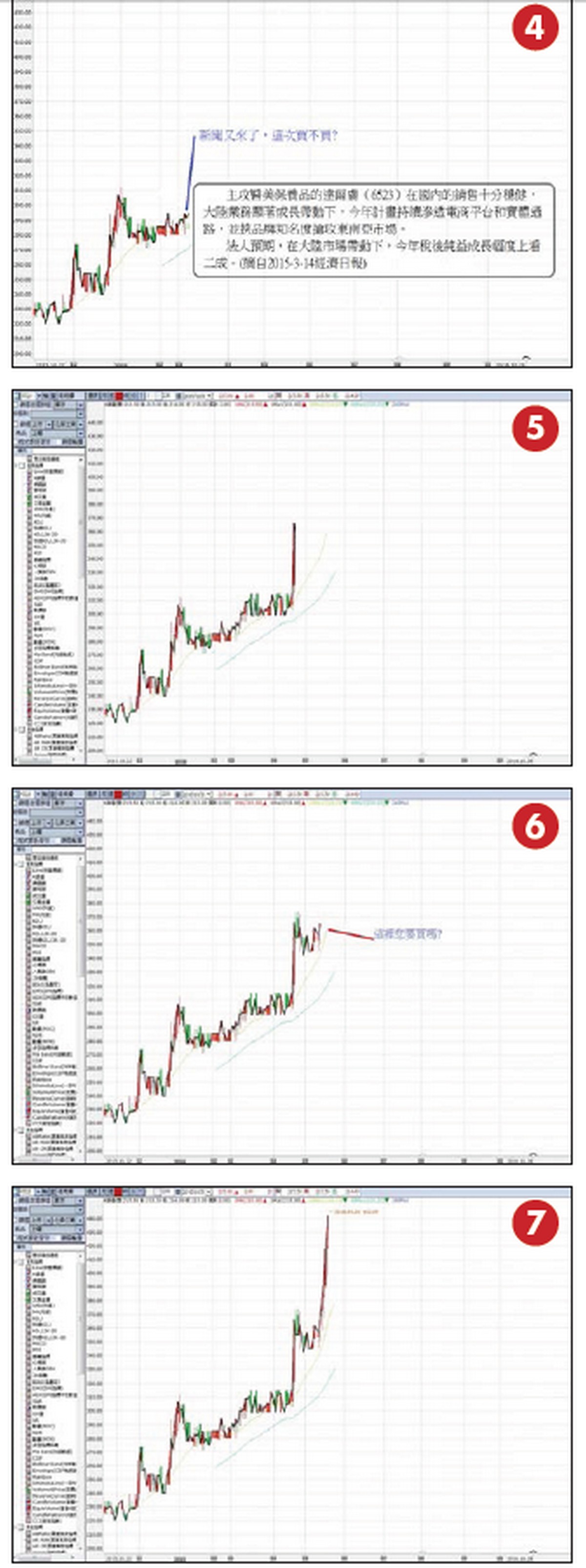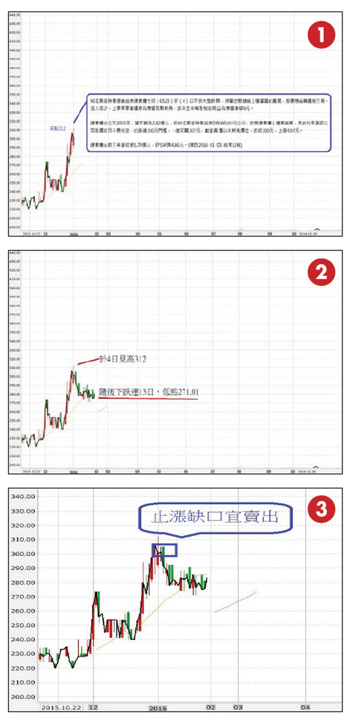 聞風動不動 新聞的讀與「毒」 箱波均如何解讀學習箱波均之前,我常看電視的財經節目、投顧解盤,每每聽到報導那檔股票有利多就追買進去,結果大多數是套牢,等到受不了停損殺出後,偏偏就在這時候漲了!也有見新聞報導利多,結果愈不敢買,愈是飆漲;也有報導利空,竟然還一路往上漲,還連日漲不停! 新聞報導,到底糖果還是毒藥?要買還是要賣?這種情形相信是很多人的心聲,也可以常看到一些書籍或專欄解這些而有很多不同的因應對策,但是否能讓自己實際運用得當,則各自體會。我學了箱波均之後,運用箱波均「過而不破、破而不過」的八字箴言來做判斷,作為自己進出的依據,成功的因應新聞的「讀與毒」!我用6523達爾膚來說明,在上漲與下跌過程中,如何運用箱波均解讀伴隨出現的新聞,並做出適切的買賣,成功獲利。 2016-01-05報導利多(圖一):圖一至圖三知名美容保養連鎖品牌達爾膚生技(6523)昨(4)日不畏大盤跌勢,挾著近期通過上櫃審議的喜氣,股價穩居興櫃股三哥。法人估計,上季單季營運將有機會挑戰新高,去年全年每股稅後純益有機會衝破6元。達爾膚成立於2003年,資本額為2.82億元,即知名美容保養品牌DR.WU的母公司,近期達爾膚上櫃案過關,挾此利多讓該公司股價昨日不畏利空,仍跨過300元門檻,一度叩關307元,創登興櫃以來新高價位,昨收300元,上漲4.97元。達爾膚去年前三季營收達5.79億元,EPS則有4.86元。(摘自2016-01-05 05:15經濟日報)聽到這種利多,您要買進嗎?買?請考慮三十秒,買!果然於四日見高312後,隨後下跌連十三日,低點271.01(圖二)。這則新聞說的是一個千真萬確的事實,但對看新聞操作的人來說是「毒」,以前的我一定會買,而且越跌越買,當然常常受傷。而運用箱波均來判斷,聽到此消息後,打開線圖來判斷,發現於一月六日即出現止漲缺口(圖三),此時宜賣出,不宜買進,而運用箱波均即可避開風險。新聞又來了,這次買不買?看一下好了,上次被騙怕了!確定不買?(圖四)主攻醫美保養品的達爾膚(6523)在國內的銷售十分穩健,大陸業務顯著成長帶動下,今年計畫持續滲透電商平台和實體通路,並挾品牌知名度搶攻東南亞市場。法人預期,在大陸市場帶動下,今年稅後純益成長幅度上看二成。(摘自2015-03-14經濟日報)再考慮一下,買不買?漲到366。(圖五)接下來,漲到這裡,您要買嗎?(圖六)想清楚了嗎?漲到442。(圖七) 圖四至圖七