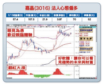 在投資人居高思危及外資法人於三月八日和十一日連兩天合計反手調節大賣二一三.九二億元壓抑下,指數再次回探一○二○四低點,不過,在多頭反彈格局不變,以及預期下檔於頸線或月線約一○二○○點附近有撐之下,在正聲廣播節目及飆股鑫天地LINE@上,老師也跟大家說過:若有壓回就是逢低布局的大好機會。隨著外資法人歸隊、季底法人作帳行情加溫,以及軋空行情如火如荼展開,後市仍不容小覷!特別值得一提的是,每年三至四月進入上市櫃公司融券強制回補高峰期,對於一些高券資比題材,且又具備轉機成長題材之中小型股,往往隨著軋空行情展開,其股價表現也都相當強勁。【個股推薦】嘉晶(3016)磊晶產量為全球第二大。主要利基題材有:(1)業績表現亮眼:受惠磊晶矽晶圓供不應求及報價調漲利多激勵,推升二○一八年合併營收達四五.二四億元,歸屬母公司稅後淨利四.三億元,同創歷史新高,較前年大幅成長約一.三九倍,EPS一.五七元優於預期,董事會決議今年每普通股擬配發一元現金股利,股息配發率達六四%。今年以來受矽晶圓需求轉弱影響,法人原預估嘉晶第一季營收恐季減二位數百分比,唯累計前兩個月合併營收六.八六億元,年增一一.四二%,表現優於預期,加上農曆年後國際IDM廠開始提高功率半導體投片,對磊晶矽晶圓採購見回溫,且矽晶圓出貨價格持平,預期第一季營收可望優於先前預期。(2)營運前景看俏:嘉晶近幾年持續投入新一代功率半導體的磊晶矽晶圓研發及生產,包括超接面金氧半場效電晶體(MOSFET)、應用在電動車或5G基地台的SiC與GaN等新複合材料矽晶圓,都可望在今年開始提高出貨量。受惠MOSFET(金屬氧化物半導體場效電晶體)及IGBT(絕緣柵雙極電晶體)等功率元件強勁需求、報價調漲、國際IDM大廠擴大委外代工,以及因應電動車及自駕車、5G高速通訊、人工智慧及高效能運算(AI/HPC)等新應用快速崛起,包括Infineon、ON Semi、德儀等提前卡位第三代半導體關鍵材料碳化矽(SiC)與氮化鎵(GaN)市場,嘉晶已投入GaN及SiC的矽晶圓及晶圓代工技術多年,加上國際IDM廠已對嘉晶釋出合作邀約,希望深化在超接面MOSFET、SiC及GaN等領域的合作,嘉晶將可望掌握致勝先機,今年營運持續爆發大成長可期。(3)國內唯一同時提供碳化矽、氮化鎵兩種磊晶製程廠商:對應SiC、GaN基材材料特性所發展出的功率半導體晶片,如:MOSFET、IGBT等,於市場發展功率半導體應用時,亦將因基材特性提升、導入應用效果優化,超越以往因矽基材性能較低造成的應用限制。因SiC、GaN基材具備更佳的低電流阻抗、高電能轉換效率、耐高溫及低過熱風險、耐高壓等運作優勢,結合動力模組的體積、重量同步縮減,有利電動車進一步延長「單次充電後行駛距離」,亦間接有助於全球電動車市規模持續擴大。因此,誰能掌握碳化矽與氮化鎵關鍵技術,將可望帶動未來營運及獲利大爆發。根據券商報告表示,預估未來五年碳化矽與氮化鎵功率元件與模組的年複合成長率為二一%、八三%,嘉晶除了四吋SiC碳化矽、六吋氮化鎵已經正式出貨外,今年將更進一步導入六吋碳化矽磊晶製程。【操作建議】低接不追高,股價已累積一段不小漲幅,不過,在內外資法人大戶力挺偏多不變,以及雙軋行情啟動(截至三月十二日,融券餘額達四七五○張,券資比達三九.九%),預期短線震盪換手整理過後(※基本面資料若有異動,依公開資訊觀測站最新訊息為主),只要「控盤指標」及「攻擊力道」可雙雙翻紅轉強,後市仍可望有一波軋空行情,基於風險考量,請設好停損停利(詳見附圖說明)。