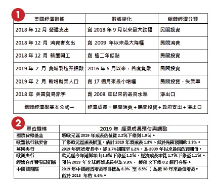 從國際貨幣基金、英國央行、歐盟委員會至中國國務院紛紛調降或下修二○一九年的經濟預測後,全球股價指數依然震盪走高!全賴美國總統川普編導的中美貿易談判大戲不斷吹送的暖風,哄抬指數有如迎風飄蕩的風箏般走揚,但仍不敵歐洲央行總裁在貨幣政策會議後,宣布持續寬鬆政策直到年底的言論,就如一股亂流壓低風箏的上升。市場開始猜測漲勢是否結束?回歸經濟基本面利空的調整就該走跌嗎?一、近期利空因素彙整將近期利空因素做分類,檢視這些利空因素所影響的經濟層面(表一),若從美國內部的經濟數據變化來看,幾乎總體經濟結構的四大層面都出現負向調整風險!雖然川普上任後,推動減稅方案有利於激勵企業的獲利提升,但也因為減稅幅度較大,引發政府稅收可能大減,進而必須受限於財政舉債上限以及支出受限的擔憂。再從各大國際單位機構對今年經濟成長預測的下修調整幅度來看(表二),平均經濟成長率預測值下修幅度大約是五~三五%,尤其是歐洲,潛藏的風險程度似乎相對嚴重。二、期貨市場如何配置與規劃較為妥適考量到經濟數據的衰退以及經濟成長率的預測下修,股價指數在反映完川普中美貿易談判大戲的底牌後,終將回歸經濟基本面,但相對的,各國政府單位肯定也會準備相關的救市與干預市場措施;所以在期貨的標的挑選方面,盡量以政府單位比較不會過度干預的商品為主。