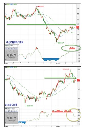 再考量商品目前的價格位階及趨勢型態,筆者認為輕原油及黃金仍是兩大值得資金關注及配置的焦點!輕原油的價格走勢,反映著未來經濟的成長或衰退,這一點可以從輕原油與S&P500指數期貨將近七成正相關程度看得出來;在預期經濟成長率可能衰退的情況下,未來股價指數在反映完中美貿易談判的可能利多之後,拉回修正機率偏高!故預期輕原油近期也可能在反映相關利多,或隨著股價指數挑戰高點後,觸及原油自身的技術面型態反壓關卡。以附圖當下時點走勢推估上檔大約五%空間,但留意向上觸及反壓關卡之後的回檔調整,依指標位階推判,拉回測試季線的可能性也不低。規劃上,可逢上檔的型態反壓關卡附近,偏空布局。黃金同樣的在預期美國經濟可能陷入停滯,中國、歐洲可能陷入五~一五%的衰退預期下,黃金需求買盤可能減弱,除非第二季起,各國政府有大量增持黃金現貨做為儲備的明確計畫,否則黃金短期走勢可能會隨著美元的短線回軟而反彈至月線關卡附近,然後回歸經濟衰退的預期而走弱。故規劃上,黃金短線有機會反彈至月線附近,多方短線操作較為合適,逢關卡附近進行調節;若關卡未見追多買盤,可反向布局空方部位。