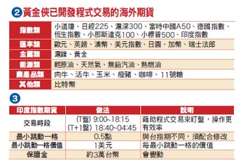 由此可見,新加坡交易所率先成功的開發出亞洲各國股價指數期貨商品,主要因素是善加利用早期從美國芝加哥交易所取得的技術優勢,在各國相關交易所還沒推出股價指數期貨商品時,領先推出商品,搶下市場先機。當然還要搭配大環境因素,新加坡整體金融環境較為開放且國際化,提供了國際資金重要的交易管道,成為國際資金在亞洲主要的停泊站。印度指數期貨分為T盤與T+1盤兩個時段交易,事實上新加坡交易所的多種期貨商品都是這樣分兩時段,所謂T盤就是跟著該期貨商品的標的物交易時段,而T+1盤就是盤後盤,在標的物沒有開盤的時段作交易。例如摩根台指的T盤,就是跟著台灣股市的開盤時間一樣,而摩根台指T+1盤就是台指期盤後盤,新加坡摩根台指的T+1盤早從一九九七年就開始,而台指期的盤後盤是從二○一七年開始,相差了二十年。表二是黃金俠到目前已經開發程式交易,並且在理財周刊發表過績效的商品,如果投資人對海外期貨有興趣,可以從表二中挑選績效比較好的商品來操作。除了績效,最好挑選關聯性低的商品,例如不同類別,這樣可以分散風險,不至於漲時一起漲,跌時一起跌。投資多種商品所得到的利潤仍會加總,但是虧損會分散抵銷,提高風險報酬比率,使資金運用更有效率。