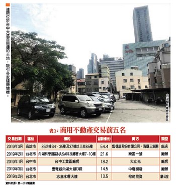 此外,根據第一太平戴維斯統計,今年第一季大型土地交易金額衝上歷史新高,達到五七四億元,比去年同期大增八九%;而商用不動產同樣延續去年底的熱絡買氣,在台商擴大生產布局與縣市首長拚經濟效應下,單季成交金額為一九二億元,年增率達六三%。第一太平戴維斯總經理黃瑞楠表示,建商獵地不停歇,土地市場罕見在第一季即衝上交易新高,其中有近八五%土地交易由建商囊括。值得注意的是,建商嗅到市區商辦老舊及都更危老衍生的商機,積極購置商業用地或都會區的工業土地,主要鎖定台北市與新北市,將推案重心從住宅開發轉向興建商辦及科技廠辦。例如興富發砸下五十一.一億元標得大同復興北路商業地,將興建商辦大樓;華固則斥資二○.五五億元購入新莊工業地,將強勢回歸廠辦三雄之列;江陵建設、京城及宏普建設皆分別取得商用土地,合計第一季建商購置商辦及科技廠辦土地即達一四五億元,幾乎占建商購地比重三成。黃瑞楠表示,工業不動產持續成為商用不動產市場交易重點,單季交易占比近三五%;雖然中美貿易戰休兵九十天,台商遷廠的急迫性降低,但中央政府積極提供配套措施引台商回流成效顯著,已有超過十八家知名廠商通過申請,後續仍有三十多家表達高度回台投資意願,帶動工業地產需求。從區位觀察,北台灣及中台灣的工業廠房交易較為熱絡,以台中為據點的大立光,第一季再度斥資二十八億元購入台中工業區兩個廠房;台灣美光與京元電子亦分別以五.三三億元及八.五億元在中科后里園區及苗栗擴廠(表三)。華固重返商用市場而以往房市好賣,較少著墨在商辦大樓及廠辦工業用地的建商,如今卻有華固將重返商辦市場,興富發則加速商辦土地「庫存量」,連旗下的潤隆都積極買地。近期的消息包括,華固於三月十九日公告,以二○.五五億元,取得新莊區建國段工業用地,董事長鍾榮昌表示,大家都忘了,以前華固也推了不少廠辦大樓。他說,一般住宅進入微利時代,而隨著台商回流,近兩年的商辦、廠辦市場供不應求,故未來打算提升商辦及廠辦的營收占比來到三成左右,目前手中有三大商辦及一大廠辦案。總經理洪嘉昇補充,目前大直「亞太置地」商辦案總銷八十億元,預計明年可完工,將採完工再銷售,另規劃在士林科技園區案約有十五億元,內湖五期潭美案總銷有三十億元,若再加上新莊廠辦案總銷可有六十億元,合計一八五億元。負責該標案的受委託方為仲量聯行,其投資部資深副總經理吳瑤華表示,在新北的廠辦交易中,有近半數起因於原有房舍老舊,得搬遷至設備新穎空間之需求,且選址多以鄰近區位為主。此次華固購置的新莊工業土地,是該區近來少見的大面積優質投資標的,且鄰近塭仔圳重劃區,該重劃區預計超過六千家廠商下半年恐將面臨迫遷,在地利環境及交通區位優越下,華固興建的廠辦有相當高機率成為塭仔圳重劃區廠商搬遷首選。中部建商搶標好物件此外,國內雨衣龍頭廠商達新工業委託CBRE世邦魏理仕公開標售台中市西屯區台灣大道大遠百商圈的六筆土地及一筆建物,土地總面積約六六一.八七坪、建物面積約三○四.五七坪,也於三月二十二日標脫,由理仁建設以總價近新台幣六.二二億元得標,溢價率約一五.二%。世邦魏理仕台灣董事總經理朱幸兒指出,此次共吸引七封標單參與競標,全為在地知名建商,各封投標金額相當接近,其中次高標廠商為華相建設,投標金額差距僅百餘萬元,反映出投資人熱烈搶標程度。而能吸引多家建商投標的主因是,該標售土地位居台中精華地段,且基地方正,極具改建增值潛力。據世邦魏理仕研究部統計,近三年台中市土地交易於二○一八年達到高峰,單年創下新台幣三二三億元成交量,其中近七成為本土建商購入,顯示建商看好未來台中房市發展潛力。世邦魏理仕接著又在三月二十五日丟出消息指受委託標售台南新興港灣市政特區兩千坪商業土地,總銷金額為新台幣一四.六五億元。朱幸兒表示,此次難得釋出的兩千多坪商業用地,土地使用強度高,適合各式商業開發及興建住宅,並具備增值潛力;另台南國平重劃區是當地著名豪宅聚落之一,更是全台灣重量級建商積極搶進熱門區域,包括興富發、富立、泰嘉、聯上、天玉集團等,已先後搶進開發國際品牌飯店及高級景觀宅,尤其近日拍板定案的安平港遊艇碼頭區開發案消息公開後,更為此區未來整體發展注入強心針,可望成為台灣的「摩納哥」。大咖建商有口碑 兩大廠辦熱銷至於早先就已投入廠辦大樓案的遠雄建設,據銷售的遠雄房屋總經理張麗蓉表示,隨著北市A級商辦供不應求,加上台商最新一波資金回流潮,對於科技廠辦和辦公室的殷切需求,讓遠雄汐止「U-TOWN」一期接近完銷,而「U-TOWN」二期準備在第二季公開銷售,有信心去化會更加迅速。此外,因商用不動產市場持續熱絡,辦公室租金看漲,遠雄預計明年推出南港廠辦新案,基地位置坐落成功路一段,佔地一六三九餘坪,全案總銷金額二十一億元。張麗蓉表示,目前廠辦與廠房用地交易價量齊揚,可見工業區土地、廠辦受台商回流設廠需求影響,熱度持續增溫。而國揚看好大汐止科學園區的發展,砸下近十億元買下新台五路一千四百多坪土地,大手筆打造「國揚矽谷」,而有「廠辦界愛瑪仕」之稱的頂級豪辦園區,總經理彭邵齡表示,因為反應熱烈,未來還會再伺機購地,增加廠辦營收比重。