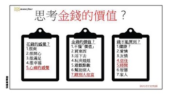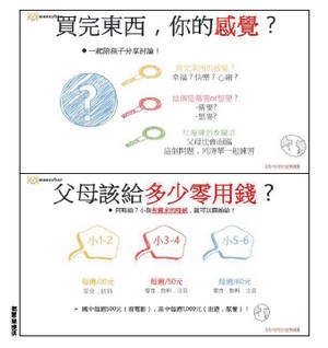 藉由「零用錢」引起孩童的學習興趣,鄧慧琹特別提出一套親子理財的方法,若家中小朋友約國小年紀,每個禮拜父母可給予孩童五十元零用錢,父母自己則有一百元的零用錢,在每月當中,抽空與孩童逛街消費,運用便利貼的方式列出所有收入及支出。同時,提出存錢觀念,而父母能擔任孩子的「父母銀行」,如果小朋友每個禮拜存十元,四個禮拜就有四十元,這時父母可以給小孩十元當作利息。小朋友在心理上覺得現金增加了,間接可培養儲蓄的習慣。鄧慧琹說,「理財教育其實就是家庭教育的一環。」要將理財概念帶進生活中並不是難事。就像零用錢可以教導孩童編列預算、懂得消費支出及控制心理欲望…等。但須注意一點,家事不可換取零用錢,這是鄧慧琹強調的,因為家事是每位家庭成員應盡的義務,無交換條件可言。另外,還可善用「獎學金」鼓勵孩童表現優異。首先,父母必須了解孩子本身的個性,有些孩童會將獎學金儲蓄下來,有些則反之。不過,鼓勵性質的獎學金金額不能太高,畢竟學生最基礎的本分就是讀書,讀書不是為父母而讀,這也是父母需要釐清的觀點。再來,與孩子溝通必須確立有獎必有罰的規則,才不會讓孩子陷入功利主義,事事都需要對等價值的交換。正確的金錢價值觀 才不會苦了父母「金融哲學」的認識若能從小教育顯得相當重要,父母必須讓孩童了解「金錢不是萬能」,並且學會思考金錢可帶來的幸福價值為何,才不會讓孩童對金錢產生偏頗的觀念。鄧慧琹舉例,在出遊時,經過便利超商,若孩子手上有零用錢,可藉由一些機會,例如:「媽媽覺得口渴,你可以請媽媽喝一杯飲料嗎?」讓孩子認識與家人分享也是一種幸福,久而久之,分享的行為亦能改變孩童對於錢的在乎程度。