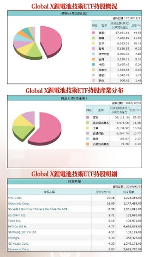 近年來消費性電子產品市場趨向穩定,因此應用在消費性電子產品的鋰電池市場規模呈現穩定的趨勢;而近年新興起的應用則是儲能產業,預計隨著各國積極推動再生能源與儲能系統,未來儲能系統市場規模仍會持續成長。鋰礦價格回跌 正是引爆需求的甜蜜點鋰電池目前市場規模最大且仍然持續成長的應用為車用鋰電池,因此電動車對鋰電池的性能要求將影響鋰電池與鋰電池材料的技術發展趨勢。對於電動車廠而言,電動車重要的性能包含售價、消費者整體持有的成本、行駛距離、行駛的性能。鋰電池主要是由正極材料、負極材料、電解液、銅箔、隔膜所組成,其中,正極材料最為關鍵,占總成本四成左右。鎳鈷鋁酸鋰三元電池,是目前製造正極材料的主流技術之一。其中,鈷是一個重要的原物料,原本作為染料與醫療用途的鈷,因為手機、筆電等3C產品電池,以及電動車引爆的需求,而成為近幾年最熱門的金屬。另外,鋰也是受惠於新科技趨勢的金屬之一。一輛電動車電池組的鋰用量,往往是一支智慧型手機鋰電池的一萬倍以上。過去五年來,碳酸鋰報價曾經飆漲高達三○○%以上,因此,近年來礦商紛紛大肆投入大筆資金開採,於是鋰礦二○一八年價格開始出現顯著回落;不過,電動車與儲能系統的發展趨勢不變,需求仍在高速增長階段,鋰礦成本的降低,長期而言有助電池更便宜,使電動車更普及。總部位於倫敦的指標礦產智庫(Benchmark Mineral Intelligence)發表報告預測,全球鋰電池需求量將從二○一六年的八十五Gwh成長至二○二五年的近八○○Gwh。投資人該如何參與鋰電池的高速成長商機呢?最簡便的方式就是透過投資鋰電池股票指數基金(ETF),搭上高速成長列車。目前全球最具指標性的鋰電池股票指數基金(ETF)就屬Global X Lithium & Battery Tech(代號為LIT,在美國上市)。該檔ETF涵蓋全球鋰礦開採商及鋰電池股票,包括LG化學、三星SDI、Panasonics、特斯拉、Yuasa與中國比亞迪等公司。觀察Global X鋰電池技術ETF的內涵,目前持股比重最高為美國FMC Corp(占二三%)。FMC是一家綜合性的化學工廠,當今全球鋰加工是由FMC、Albemarle(ALB)、智利Sociedad Quimica Y Minera De Chile SA(SQM)和中國的天齊鋰業等四家公司主導市場。其中,智利SQM與美美國Albemarle分別是Global X鋰電池技術ETF持股比重第二與第五的成分股。此外,包括日本Panasonic與GS Yuasa,以及韓國三星SDI與LG Chem、中國比亞迪等電池廠均為Global X鋰電池技術ETF前十大成分股之一,目前全球電動車電池主要供應商不外乎是日本、韓國與中國的廠商。