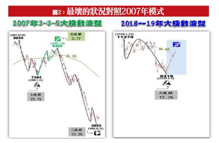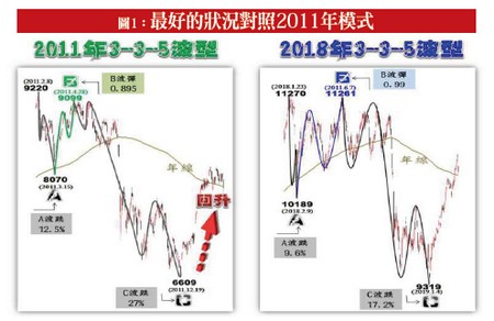 台股自一月四日見到九三一九點後一路青雲直上,一條龍式的漲法在三月二十二日前漲得基本教義派開始懷疑人生,在是否倒戈「初升段」門派間舉棋不定,操作起來自然吃這個也癢吃那個也癢每多掣肘。台股本波強漲是不是「初升段」的徵兆是本文所欲探討的主題。而無基之彈背後意涵到底是小三變正宮?抑或黃粱一夢誤會一場?以下試從技術對照總經雙面向加以抽絲剝繭。【最好的狀況是二○一一年第二次歐債危機案例】這波漲勢對於心中投「初升段」一票的投資人而言,最可援引的案例是二○一一年九二二○至六六○九點然後回升至二○一五年一○○一四點這段波型。圖一是現今技術面與當時的對照。乍看之下,相似度高達九○%。就波浪理論,多頭式的回檔走ABC模式。其中可以是A走三浪、B走三浪、C走五浪的延伸型態。二○一一年當時回檔原因是第二次歐債危機,ABC修正後隨著寬鬆資金及美國強勁經濟數據支撐下,美股帶領全球股市繼續創高,台股也順勢回升突破九二二○,隨後見到二○一五年的一○○一四點。二○一八年回檔模式是基於美國縮表及中美貿易大戰。接下來只是因為美國暫緩升息以及貿易戰擱置,就讓指數上漲突破年線。是以技術派人士認為這是強力多頭回升訊號,線型會說話,線型也會領先基本面。