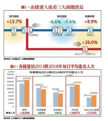 反觀東區商圈未能發揮中心地理位置優勢,加上大巨蛋興建又遙遙無期,整體商圈缺乏優勢的主題定位與吸引力,市府不考慮創新的活化元素,卻考慮採納學者意見徵收空店稅,勢必會將加速商圈的沒落與沉淪。他說,東區商圈地段仍優,人潮仍多,只是受商圈消長因素影響加上缺乏購物的主題誘因,被排擠而淪為傳統商圈,尤其是網路盛行新零售時代,傳統商圈大店面空置率升高是必然趨勢,這種現象已經不只是東區的問題,這些傳統商圈因消費氣勢轉弱,但房東們尚未體認事實,堅不降租,過渡期空置率才會增加,這種轉變需要調整一兩年,市場機制自然會讓房東體認事實,一旦降租,空置率自然下降。捷運人潮反映商圈變化而造成東區商圈生意大不如前的關鍵之一,跟「人」有很大的關係。永慶房產集團總經理葉凌棋表示,根據台北捷運公司統計,觀察二○一四至二○一八年「捷運藍線」各站捷運進出人次,東區商圈兩大捷運站運量均負成長(圖一),反觀位於西門商圈的西門站增加一五.七%,信義計畫區兩個捷運站人流也呈正成長,台北101/世貿站更大幅成長二六%。而在人數增減方面,根據台北捷運公司統計,近五年各站捷運平均每日進出人次,東區商圈的兩大捷運站每日人流減少一.三萬人次,反觀位於西門商圈的西門站每日人流增加約二萬人次,信義計畫區兩個捷運站人流每日增加二.三萬人次(圖二)。