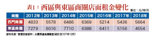 葉凌棋指出,以一般街邊店面來說,人潮即錢潮,沒有人流,商圈當然會有蕭條的危機,加上消費習慣的改變,民眾想到實體店面購物時,逐漸由街邊店轉向為一站式的商場百貨購物型態,能滿足全客層需求,若街邊店面商圈無法找出特色與商品區隔,街邊店面前景受考驗。俗話說,「三十年河東、三十年河西」,永慶房屋業管部經理謝志傑表示,二十多年前,東區商圈的崛起,與西區的沒落,曾經是截然的對比,沒想到,「西區軸線翻轉」後,如今的西門町有如浴火鳳凰般重生。西區軸線翻轉 店租超越東區而東區店租昂貴,國際品牌陸續退場,東區商圈轉趨沒落,以致西門町的店面平均租金行情在二○一七年就已經超越東區商圈,甚至在去年更增加至五六六四元,反觀東區商圈卻跌落五千元大關(表一)。永慶房屋敦仁店協理鄭朝鶴表示,早期復興南路至敦化南路間的每坪月租金行情,最高可至二.五萬元,但現在約一.二至二萬元間,另敦化南路至光復南路間,最高約一.五至二萬元間,目前約一至二萬元間。他說,三、四年前,東區商圈的店面投資報酬率約在二%左右,而更早期持有者,成本更低,投報率還可以再高些;但如今,若一般店面投資者想保有二.四%至三%的投報率,則店面房價勢必要再降個兩成才行,唯目前東區店面的房東,有很多都是早期持有者,寧願空租也不太願意降房租,有些就怕一降,房價跟著降,但這種「堅持」,就要看他們未來的忍受度而定。