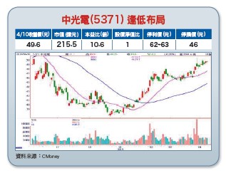 某股近年由背光模組製造轉型為顯示器系統整合供應商,並分割出五家子公司:宇康醫電(體適能評測軟體及分析平台)、誠屏科技(智慧顯示屏)、譜鉅科技(手持式光譜儀及雲端服務)、中光電智能雲服(公共推播、智慧零售、智慧校園)、中光電智能機器人(商用無人機安控解決方案)。中光電智能機器人公司在智能無人機技術醞釀達四年之久,去年已正式出貨,打入美、日軍方及政府等單位,也獲多家Fortune 500企業青睞,二○二○年美國無人機法規開放,日本東京奧運登場等激勵下,後續成長潛力值得期待。某股為中光電(5371)展望未來,中光電將持續開發輕薄短小及節能、防窺專用、高動態對比(HDR)的高價值應用顯示器產品,由於公司具有不含背光模組面板(Open Cell)、導光板、觸控螢幕以及組立全部內製的一條龍技術及生產整合優勢,已順利接獲國際客戶訂單。中光電智能機器人擁有電腦視覺、人工智慧、高速運算與控制相關等先進技術,推出的全自主智能飛天機器人,以人工智慧和感知融合系統為核心,可讓無人機實現全自主飛行、偵測感知、智慧路徑規劃、精準降落及自動充電等巡航任務。不僅成功進軍美、日包含軍用、工業、政府等單位,在台灣也取得水利局、竹南銅鑼科學管理園區等訂單,未來更將結合機器人技術,布局人工智慧、物聯網等領域,成長動能不容小覷。【操作建議】股價於年初突破二十日均線之後,就穩定沿著二十日均線走高,由於量價結構並無異常,拉回量縮即可逢低切入。