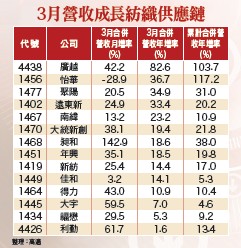 北美成衣庫存水位維持低檔,Nike、adidas等一線運動品牌又走向快時尚化,大幅縮短供應鏈交期,降低預測失準導致庫存堆積的風險。隨著時序進入奧運年前新品推出高峰期,在備貨需求帶動下,對成衣代工、布廠的拉貨需求將明顯轉強,加上上游化纖市場供需也逐步改善,第二季起紡織供應鏈有望出現全面復甦的產業榮景!首季營收動能強 報價掀起調漲潮紡織族群三月合併營收年增一一.七%,位居台股產業漲幅排行第二名,第一季營收年增一○%,同樣也位居台股產業漲幅排行第二名。其中,不乏有創同期新高的廠商,提供產業復甦的最佳證據。例如上游化纖廠遠東新(1402)三月營收創同期新高及歷史第二高;中游布廠得力(1464)創歷史新高、新紡(1419)創同期新高及歷史第六高、染整廠大統創新(1470)創歷史新高;下游成衣代工廠聚陽(1447)創同期新高及歷史第四高。此外,聚酯絲(POY)廠宏洲(1413)三月開始進行今年第一波價格調漲,平均報價上漲一元,來到每公斤三九元台幣,顯示我們預期的報價調漲潮已敲敲展開,有利族群股價評價的提升。全球品牌服飾廠採購集中化的趨勢及面對東南亞當地企業低價搶單的惡性競爭,逼得台灣紡織供應鏈不得不開始合縱連橫來對抗中國大軍。目前東南亞紡纖供應鏈中,競爭最激烈的就是下游成衣加工,國內的聚陽、興采(4433)、廣越(4438)等,近期都已和上中游廠策略聯盟合作,或投資往上游設立垂直整合生產線,來增加競爭利基。