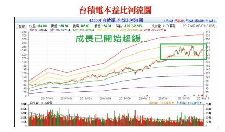 當然,這個數字是一個粗略估計出來的,其目的只是為了要讓投資人知道,只要是大型企業有穩定的產業週期以及出貨週期,其實都可以透過每次的法說會內容來建立出自己的一套比較標準,重點不在數字能估到多精準,而是提供未來每個月營收在公布的時候的好壞比較標準。比如,筆者利用台積電第二季財測區間的高標來預估數字,所以大致上可以得出一個結論就是:台積電今年就算再好,也好不過去年!然後有了每季的營收數字,除以三之後就可以得到每個月營收的比較基準。當然,因為這是用最樂觀的高標數字建立出來的,所以只要比它好,台積電今年就會比預估好,反之,則差。本益比河流圖看未來再來看看台積電的本益比河流圖,所謂的本益比河流圖就是動態的本益比所形成的長期趨勢,簡單來說,本益比河流圖代表的是企業所處的產業趨勢,左下到右上為多頭代表產業趨勢為多;反之則為左上到右下,為空頭趨勢產業。從台積電的本益比河流圖的走勢不難發現,過去十年晶圓代工的確是個成長性良好的產業,但從近兩年開始河流圖的走勢開始趨緩,表示產業進入到成熟高原期,成長性減緩。