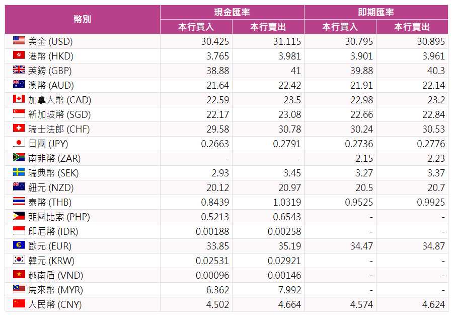 在外匯交易中,最常見的是到銀行去換匯,在銀行大廳中,會有一個匯率看板,上面顯示各貨幣兌換的即時報價,附圖我們用台灣銀行的匯率表來做說明。最左邊是貨幣商品,需要兌換什麼幣別,就看相對的欄位,再來「現金匯率」跟「即期匯率」兩部分,現金匯率指的是有拿到鈔票的,即期則是兌換後放在帳戶中的外幣,外幣存款或匯款都是參考即期匯率。「現金匯率」會比「即期匯率」來得差,所以如果沒有真正需要拿鈔票做事情,一般都不建議兌換現鈔。再來,常讓大家錯亂的是買入跟賣出的價格,舉例來說,我們今天要把台幣換成美金,也就是我們要「買入美金」,銀行要賣出美金,一買一賣才能成交,這時我們要看的是「本行賣出」報價,也就是30.895。相反的,今天要把美金換成台幣,我們看的欄位是「本行買入」,也就是30.795報價。仔細觀察會發現,買入跟賣出價格不一,買賣之間的價差,在外匯中稱為「點差」。假設有一個人買入美金匯率30.895,馬上又賣出美金30.795,他會立刻損失0.1元,「點差」是換匯中需負擔的成本,也是銀行換匯賺錢的來源,所以這邊也提醒大家,如果想靠匯率賺取價差,起碼要賺超過「點差」,才有辦法在外匯市場中獲利。