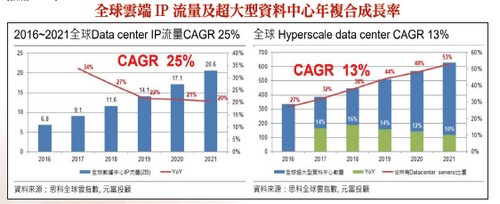 拜亞馬遜及臉書等科技巨頭持續拓展網路服務內容所賜,資金中心資本支出將隨之而增加,有望讓上半年降溫的伺服器市場提早見到春燕。受到中美貿易戰為產業帶來不確定性,中國廠商訂單縮手,加上組件價格開始自高檔反轉,造成大型資料中心建置時程推延,連帶伺服器廠商第一季營運也受到拖累,預期在訂單需求轉強下,第二季廠商營運將陸續回溫,下半年重回成長軌跡,將有利相關供應鏈的股價表現。北美資料中心需求 為景氣榮枯關鍵目前伺服器市場景氣榮枯還是要看北美資料中心需求的臉色,研調機構DRAMeXchange從市場面分析,二○一八年全球伺服器主要成長動能仍來自於北美品牌廠的貢獻,占比逾三成。就伺服器屬性來看,商務型伺服器仍為現階段出貨大宗,其中出貨至網路型資料中心的比重逐年攀升,今年將由二○一八年的三五%成長至四○%。就客戶來看,美國的亞馬遜、谷歌、微軟及臉書也正是全球四大資料中心伺服器客戶,占有全球逾六成的市場需求。根據市調機構的統計數字,今年第一季亞馬遜、谷歌、微軟及臉書超大規模資料中心投資金額仍年增四一%,且預估至年底前增幅仍可高於過去二年平均水準,顯示亞馬遜等業者仍積極提升本身的資料處理與儲存等數位內容的掌握程度。根據思科全球雲端指數(Cisco Global Cloud Index)報告預估,產業的成長趨勢似乎也未改變,廠商中長線的營運展望仍是可以樂觀期待的。思科預估二○一六~二○二一年全球數據中心流量將以每年約三.三ZB的量增加(自二○一六年的六.八ZB增加至二○二一年的二○.六ZB、年複合成長率(CAGR)達二五),同期間超大規模資料中心也將從三三八個增加至六二八個,年複合成長率達一三%。截至二○二一年,全部資料中心中有五三%的伺服器都將安裝在超大規模資料中心,較二○一六年時的二七%,翻了近一倍。