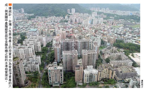 投資結構差別所造成的影響還不只於此,因為那三年裡,很多金融資產不僅沒跌,反而升值很多,政府公債和一些對沖基金就上漲不少,連股票指數在包括股息之後也基本持平。美國中產家庭的財富遭遇給我們什麼啟示呢?根據近期的統計結果,台灣人的房地產投資平均為家庭淨資產的六○%,與美國中產階級家庭在金融危機之前的水準相當接近,也顯示台灣家庭的財富顯然過度集中於房地產。除非這種投資結構有所調整,否則,會面對極高的重複美國中產階級財富大縮水經歷的風險。