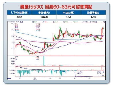龍巖營運添新動能至於大多數電子股短線跌深隨時會有短彈,但只要美中貿易戰持續升溫,對下半年傳統旺季,多數電子或多或少都會有影響,所以波段仍往下看,建議反彈到壓力時先減碼避開,待落底有較大行情時,我們再進場做多電子。也因此多頭的資金避風港,皆以獲利穩定的高股息殖利率的金融、傳產為主,這段期間股價也相對電子強勢而比較有表現空間。龍巖(5530)第一季EPS為一.五四元,日前將台北市忠孝東路「太平洋商業大樓」的辦公室三個樓層以十四.二億賣給萬海航運,預計處分獲利達五.二七億元,EPS約可貢獻一.二五元,快則第二季、慢則第三季可望入帳。展望下半年,龍巖大陸溫州瑞安陵園墓園依工程進度,預計第二至第三季將陸續完工,第三季將可正式銷售,龍巖與遠揚合資持股比率各五○%,銷售業績將由業外認列轉投資收益,將有下一波營收和獲利的新動能加入。今年預計配息三元,股息殖利率也有接近五%左右。股價在打底三個月後,所有均線糾結向上並往上突破,後市可特別鎖定留意。