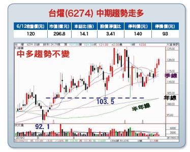 短期而言,台股仍有輪動續彈機會可期,主要原因包括:第一,美墨貿易緊張關係趨緩,美國無限期暫停對墨西哥課稅,加上美聯準會降息預期升高,帶動美股止穩反彈。第二,白宮預算管理辦公室代理主任致函美國副總統彭斯和部分國會議員,要求推遲四年後才實施華為禁令,讓美國承包商有更多時間尋找解方,據傳美方有意再延長對華為禁令九十天,可望暫緩市場壓力。第三,上市櫃營收打破五窮魔咒,單月營收達二.八二兆元,月增逾二%,年增○.一四%,創歷年同期新高,優於市場預期。雖然短線或有輪動續彈機會,不過還是不可掉以輕心!除了香港「反送中」立法情緒高漲,牽動六月十二日相關金融股下殺拉回,再者,美中雙方針對雙邊貿易問題持續僵持不下,將是牽動後續全球股匯市發展最大變數。尤其在月底日本大阪G20會議前夕,繼「華為禁令」風暴持續延燒,「東京威力科創」也被加入封殺行列,且川普再度放話表示,如果習近平不在日本G20峰會上與他會面,將立即針對三二五○億美元中輸美商品徵收二五%關稅,甚至遠高於二五%,若雙方不歡而散,甚至貿易戰全面開打,其衝擊影響與後果將難以想像。故近期若有下殺拉回,各位務必要記住:六月十日一○四六六低點絕對不可破!因為一旦跌破,指數恐將有再探底的危機,不可不慎!【個股推薦】台燿(6274)為國內四大銅箔基板廠之一,產品應用涵蓋手機板、基地台背板、通訊板、伺服器、車用板等。主要利基題材有: (1)躍居銅箔基板獲利王:搭上伺服器以及網路獨特成長商機,在電子業成長性普遍下滑環境中,顯得更為耀眼,二○一八年每股盈餘繳出七.四六元好成績,營收、獲利、每股盈餘等皆創新高,並較二○一七年每股獲利四.一二元大幅成長逾八一%,表現優於市場預期,躍居銅箔基板每股獲利王。(2)第二季及下半年營運看旺:受季節性淡季影響,第一季營收三八.八二億元略顯疲弱,略遜於去年同期,稅後淨利三.八億元,EPS一.五四元,仍創下歷史同期次高紀錄,五月營收十五.二億元,月增○.六%,年減○.五六%,近八個月新高,累計前五月營收達六九.一億元,創歷年同期次高。隨著網路速度的提升以及技術的突破,許多新興應用與服務逐漸顯現,包括超高畫質影音串流、物聯網相關應用、人工智慧與大數據分析、雲端運算儲存、AR/VR等,隨著全球數據流量的高速成長,帶動網路服務營運商及電信商必須更新設備滿足市場需求,台燿應用在資料中心所用的400G交換器T3+產品以及伺服器相關產品,可望在第二季到第三季升級至Very Low Loss並啟動,加上陸續通過客戶端認證,考量高階產品有能力的供應商少,隨著客戶庫存調整告一段落、需求有望回溫,以及新竹和大陸常熟廠等新產能可望於第三季進行量產,後市營運逐季成長可期,中長期營運維持成長看法不變。(3)外資調升評等及獲利預估值:看好5G即將步入商轉倒數,在各大廠基礎建設與終端設備積極開發布局,且客戶青睞台燿產品的性價比優勢,黏著度高,繼去年每股獲利創歷年新高,外資預估今、明兩年將可望再年增八%與三六%,二○二○年估EPS上看十一.五二元。【操作建議】低接不追高,配合中長期趨勢走多不變,以及內外資法人心態偏多,強勢守一○三.五元關卡,弱勢守九十三元關卡,短線若有拉回至年線附近,逢低仍可留意(※基本面資料若有異動,依公開資訊觀測站最新訊息為主)。基於風險考量,設好停損停利(詳見附圖說明)。