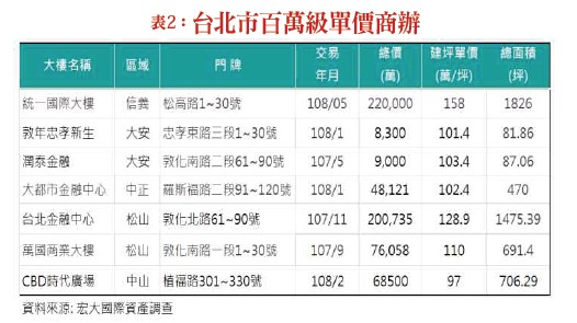 而敦化北路的台北金融中心約每坪一二九萬元、世紀金融廣場、大直CBD時代廣場、大都市國際中心、敦南萬國商業大樓、敦南潤泰金融廣場…等等,成交單價也都在每坪一百萬元上下(表二)。A辦租金行情上揚 帶動興建熱台灣商用不動產出現百花齊放的走勢,也反映在商辦的租金行情上,尤其是信義計畫區燙金招牌的頂級商辦,每坪租金都上看四千元以上。信義房屋不動產企研室專案經理曾敬德表示,台北市信義區頂級A辦大樓「國泰置地廣場」,在今年一月與二月,每坪租金站上四千二百元,這兩筆實價租金也是自二○一五年國泰置地廣場有實價揭露以來的最高價。由國泰置地廣場的實價登錄,可以看出信義計畫區租金上漲的軌跡,從二○一五年的租金單坪每坪二九九三至三三五八元,一路上漲到去年底的三九三八元,今年則刷新大樓新高到每坪四千二百元,而近年信義計畫區的上漲趨勢明顯,也帶動周邊的辦公大樓租金走揚。而目前站上每坪四千元的辦公大樓有台北一○一大樓、南山廣場與國泰置地廣場,這三棟大樓同時也是全台租金最高的三棟辦公大樓,在辦公大樓新增供給有限的條件下,市場普遍認為A辦大樓租金仍有表現空間。此外,信義計畫區內產權完整的大面積土地一地難求,先前流入法拍市場的D3土地,三拍後投資價值浮現,一千五百多坪土地,最後由豪宅建商元利建設以總價一一二.五八億元標得。曾敬德指出,D3此次法拍的土地適合開發豪宅、A辦與飯店業,而目前市場能見度最高的還是辦公大樓產品,至於豪宅應該也是每坪二百萬元以上等級的開發案,產品定位上相當多元。新舊辦公大樓掀爭戰住商不動產企研室經理徐佳馨表示,過去房市大多頭,建商買土地蓋房子,三、四年就可回收,因此,很少著墨商用不動產。但自從中美貿易大戰,加上「肥咖條款」後,不少台商資金回流台灣,進而帶動商用不動產的交易熱度。