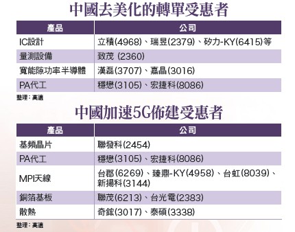 就目前盤面觀察,較獲得資金青睞的電子題材有中國去美國化的轉單受惠者及中國加速5G佈建商機受惠者,激勵個股股價領先創下波段新高。一旦未來川普鬆綁對華為的部分禁令,預期華為供應鏈的獲利及評價均有望獲得上修,進而成為資金追逐的新電子焦點。中國去美國化 轉單題材續發酵中美貿易戰升級科技戰,並陸續對華為等中國科技廠實施禁售令,促使中國廠商加速將訂單轉移至非美半導體供應鏈。尤其在華為事件後,中國產業結構上已有明顯改變,華為、中興及烽火等中國廠將供應商分成A、B、C三個等級,A級為中國廠,B級為台廠,C級為美廠,採購順序以A優先,其次為B。市場預期IC設計、半導體設備、IC封裝測試、IC載板及PA等,均有機會趁此打入中興、華為等大廠供應鏈,分食從美國廠轉出的訂單。以股價表現來看,當屬被市場視為轉單最大受惠者的射頻前端晶片器件(RF IC)廠立積(4968),股價漲勢最為凌厲。在Skyworks及Qorvo停止供貨華為後,立積將順勢填補此供給缺口,甚至連中興、烽火等也有轉單意願。唯目前股價已提前反應至明年的獲利預估,一旦未來接單量或獲利率不如預期,股價恐將面臨修正的壓力,此時並不建議再追高了!