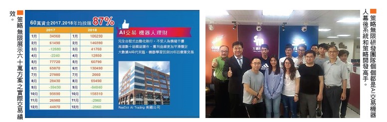 人工智慧技術應用在股市稱為「AI交易」,有著運算速度比人腦快,高頻快速判斷AI策略組合效益,機器人保持紀律不受情緒影響執行投資策略,AI交易佔交易比重已快速提升,華爾街股市交易更是直接升級為人工智慧對抗人工智慧(AI-AI)新局面。根據美國金融市場指數預測及智能策略時報指數公司(ReeDot AI Trading)指出,美國財經網站CFO四月針對三七八名美國高階投資主管調查報告指出,已有四二%高階投資主管利用人工智慧、機器學習等新科技來協助判斷、分析及做出決策,和一年前類似報告僅二五%投資主管使用這類工具相比,成長幅度驚人,顯示人工智慧正快速取代傳統投顧分析師與營業員角色。美國世界日報(World Journal)今年六月專訪我時曾表達人工智慧進行投資交易之特色說明,一、藉由機器智慧下單,能抓準時機在極短時間內高頻交易。二、克服人性弱點,「該買則買、該賣就賣」,避免貪婪與恐懼進行停利停損,避免情緒影響操作。三、可不間斷監控市場行情,人類不用盯盤,機器人觀盤自動進出場。四、人工智慧能透過回測過去數億筆交易紀錄,自動學習掌握最佳時機。五、人工智慧可以平行多工任務,執行百種智慧策略同時操盤。 過去三年策略無限將AI技術運用在指數期貨投資上有很好的成果,二○一八年策略無限榮獲未來商務展最佳技術獎,在一百多家參賽廠商脫穎而出。策略無限應用數個領域的AI演算法於程式交易系統,主要包含RNN相關LSTM, GRU, Reinforcement Learning和Time Series相關之演算法,以台指期二十年超過四億筆Tick大數據資料為基礎,建立Deep Neural Network Model讓AI不斷自我學習和精進,並架構能夠界接AI Model的策略開發回測系統,建立Tick級高速且精準的仿真(擬真)回測機制。AI機器人智慧投資是結合AI演算法進行人工智慧分析,高頻短瞬間立即判斷尋找最適投資組合,並依據市場狀況及投資人的投資需求(包括可承擔風險、期望報酬,並擴大至特定財務目標、可動用資金及投資期限等)進行客製化分析與結果產出。透過個人化結果,效率地自動選出適合該投資人的共同基金,再根據現代投資組合理論(Modern Portfolio Theory, MPT),自動規劃出在投資人可承擔風險下的最大化預期報酬的投資組合,或是依據投資人所要的投資報酬率做出風險最低的投資組合。