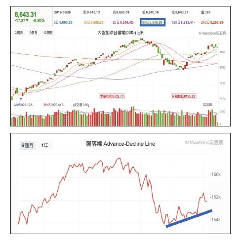 但是因為個股的情況太多種,我不可能一一列舉給你看,所以我只能跟你分享這個簡單的規則會是我判斷要留還是要出的其中一個條件。如果你覺得操作怎麼能不看大盤,要順勢做單,那我會建議你在這個特殊情況下,可以先改觀察另一個更有參考性的指數:大盤扣除台積電。大盤扣除台積電還在季線以上把被台積電影響的情況過濾掉以後,你會發現其實大盤還算OK的,起碼還撐在季線以上,沒有跌破季線以前都還算多空勝負未定。看一下騰落線的情況,我們可以知道大多數股票走勢強弱。在沒有跌破藍色上升趨勢線以前,也還不偏空。快速下結論:1.最近大盤指數失真,一檔台積電就蒸發七十點,七月份前前後後還要蒸發一百五十點左右,所以最近可以先別盯著大盤看,容易自己嚇自己。2.觀察大盤扣除台積電指數,觀察騰落線,可以幫助你看清盤勢。3.當然還是以你自己操作的個股為主,不會判斷的話,就根據季線做吧,出場條件設為今天跌破,而且明天中午十二點站不回來就出掉,因為進場點也在這附近,所以就算出場,也只會小賠一點,不會受傷過重。沒有跌破停損點以前,股票就安心續抱,既然訂好交易策略就按表操課,別想東想西,後來亂做又後悔。