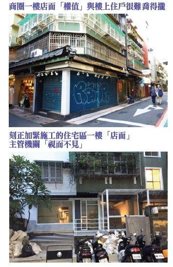 不論是都市更新或危老重建最難整合的就是一樓,雖然是住家,表面看來似乎單純,惟如基地不夠大,加以建蔽率縮減,還得設置汽車升降機設備,其次,規畫設計時常會以臨路退縮換取容積獎勵,不僅都更後較原面積縮水,正面寬度同樣也會縮減,而令一樓住戶舉棋不定。(2)一樓占用前院、後院、防火巷早期房屋預售買賣契約總是將一樓空地約定歸一樓住戶管理使用,導致各住戶總是有樣學樣的將前院砌築圍牆,大者當停車使用,小者栽植花木當自家庭園,後院則外移再加上占用一半防火巷道,以便實際使用空間增加二○~三○%。此一情況只要從「台北市地理資訊e點通」查詢,再點閱「進階查詢」地籍圖、建物套繪圖,或者再增加門牌編號、航照圖、都市計畫圖等相關項目,包括地號、公告土地現值、建照號碼與核發日期等都可一目了然,由此亦可了解老舊建物占用空地之實際現況,再據以評估權值並進行都更整合。(3)一樓違規當店面使用住宅區一樓違規當店面使用司空見慣,尤以商圈店面違規情況最為嚴重,例如最近備受關注的東區、永康或師大商圈等,雖然樓上住家一再抗議,惟一樓店面卻仍有增無減,主要原因在於主管機關總是「視而不見」,鮮少取締,尤其不少樓上住戶認為一樓店面價值提高,樓上房價也會跟著水漲船高,萬一居住環境真的惡化,只要變賣價格高還是划得來。此一情況可由最近北市都發局舉辦「師大商圈都計變更公聽會」,不少居民高舉「撤回」標語,並嚴厲批評市府「鴨霸」情況見其一斑,究竟師大商圈都計變更如何兼顧住商共榮,必然也是當前市府大力推動都更必須正視之一大課題。
