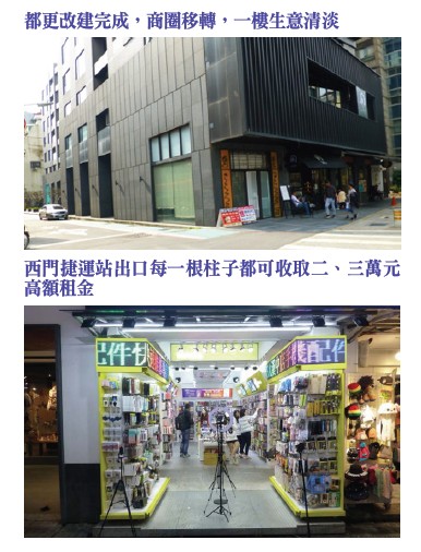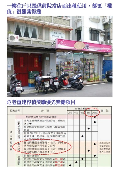 (6)「使用面積」要求轉換為「權狀面積」過去一樓前院可以停車,後院又有增建,當初購買時也是以增建後「現狀交屋」方式購買,問題就出在違建後使用面積較大,也沒人檢舉,長久以來形同就地合法,如今面臨都更或者危老重建,原住戶總會以「使用面積」要求轉換為「權狀面積」,此一問題如就新設計圖與原建物套繪圖兩相對照,即可看出面積明顯縮小,導致一樓住戶經常會因為「喬不攏」而不願參與重建。(7)租金與房價相互拉抬假設一樓原本當作店面出租使用,一個月租金十萬元,一年租金高達一二○萬元,那麼更新這段長達四、五年期間的租金損失,又要跟誰索取?尤其自主更新更是難上加難,而這也經常成為一樓店面不輕易同意重建的一大藉口。(8)退縮面積找誰討?根據危老重建容積獎勵規定,只要基地與巷道退縮淨寬二或四公尺,並與鄰地境界線距離不小於二公尺,就能享八~一○%的容積獎勵(詳請參閱附表),因此,只要合乎規定,就能增加樓地板面積,也就能將多出的面積出售,用以抵償建造費用,降低共同負擔比例,此就樓上住戶而言當然不會有任何異議,但對原先一樓店面的住戶來說,店面縮小代表營業面積縮減,這個損失又要如何得到合理的補償?(9)店面數量減少,不夠分配常見原本數家店面,重建後減少一、二家,因不夠分配而採取抽籤方式解決,但抽不到者總覺得有失公平而態度轉趨消極甚至淪為釘子戶,甚或處處杯葛,導致都更過程橫生枝節。(10)權值與分屋,向上向下延伸常見縮減後的一樓店面不夠分配,彼此都不願讓步,而實施者總認為只要總分回面積足夠,即可解決問題,亦即常見提出「一樓+地下室」或「一樓+二樓」原面積不變之分配方式,不過,最後如果還是無法協調出一、二戶退場機制,或者採取買斷方式,幾可斷定無法順利進行。(11)路沖風水問題最難解常見基地面積狹小又位處路沖、巷沖,其最大問題在於房價偏低又缺乏市場性,此外,如遇一樓店面正對前方大樓車道出入口,抑或店面因下方規畫為車道出入口懸空而毫無參與意願。(12)高齡長者居住常見一樓高齡長者獨居,日常生活鮮少與鄰居互動,即使子女表示願意參與,有時還得考慮搬遷與就醫等相關問題,至於長者最擔心的還是搬得出去是否能夠等得到搬回來的一天。(13)商圈移轉隱憂都更之後雖然房價大幅提升,然亦常見商圈轉移,而出現曲高和寡情事,由所附照片經臨巷退縮復又面寬縮減之後,生意清淡甚至大門深鎖情況,即可充分了解為何一樓住戶寧可維持老舊違建店面,而不願積極參與之主要原因。(14)商場都更,難上加難一般常見商場公設比高達七○%,除非地段良好,否則大都很難推得動都更,最近台北市政府推動老舊市場改建所衍生之諸多問題,即是最佳例證。(15)邊間兩側騎樓,實際營業面積很小常見兩側臨路的商業區店面,雖然權狀面積不小,惟卻因供公共通行的騎樓占比甚高,尤其是商業區精華地段,例如西門捷運站出口連一樓柱子都可收取二、三萬元租金情況下,要想推動都更,勢必難上加難! 總之,老舊建物都更需求愈來愈殷切,表面看來似乎機會很大,惟應事先做好功課,並確定一樓住戶的意願與配合度,俾免徒勞無功白忙一場!